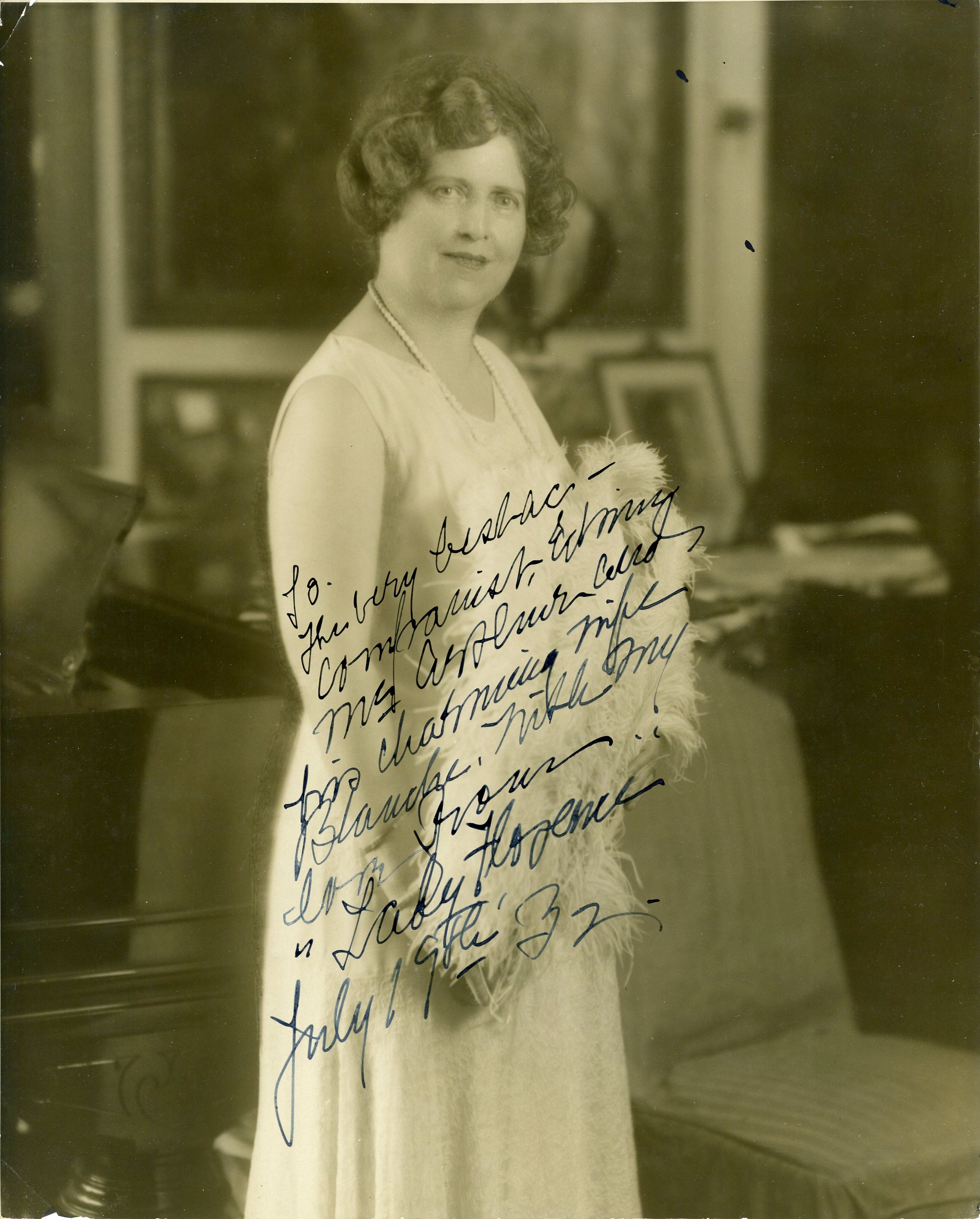 An extremely rare signed portrait photograph of the notoriously awful soprano, inscribed to her accompanist Edwin McArthur. Shown standing in her apartment, holding a white feather boa, Jenkins has penned: "To the very best accompanist, Edwin McArthur, and his charming wife Blanche. With my love from ‘Lady Florence’ July 19th '32." Mounted on heavy card. Some small corner chips and a few scattered spots, but overall in very good condition with crisp image and inscription. 7.5 x 9.5 inches (19.5 x 24.2 cm).