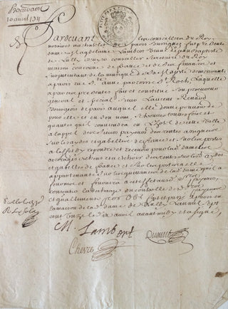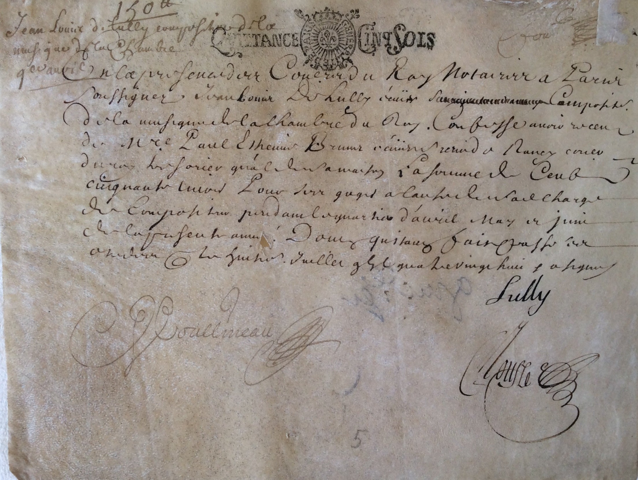 [Lully, Jean-Baptiste. (1632–1687)] Lully, Jean-Louis. (1667–1688) & Lambert, Madeleine. (1643–1720). Autograph Receipt of Wages and Signed Document.
