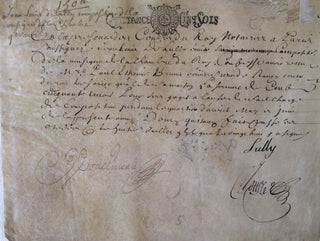 Very rare autograph document signed by the French composer and youngest son of Jean-Baptiste Lully, who died at the age of 21 on December 23, 1688, having inherited his father's job as court composer to Louis XIV in 1687. The document acknowledging the receipt of his wages as surintendant et compositeur de la musique de la chambre du roi. 1 page, on vellum. Dated July 8, 1688 (signed "Lully"). 8.25 x 6.25 inches (20.8 x 15.8 cm). Together with a document signed by his mother, Madeleine Lambert, the widow of Jean-Baptiste Lully and daughter of composer Michel Lambert. Autograph document dated April 10, 1711, and signed by Lambert and two others, 1 p. 7.25 x 9.75 inches (18.5 x 25 cm).