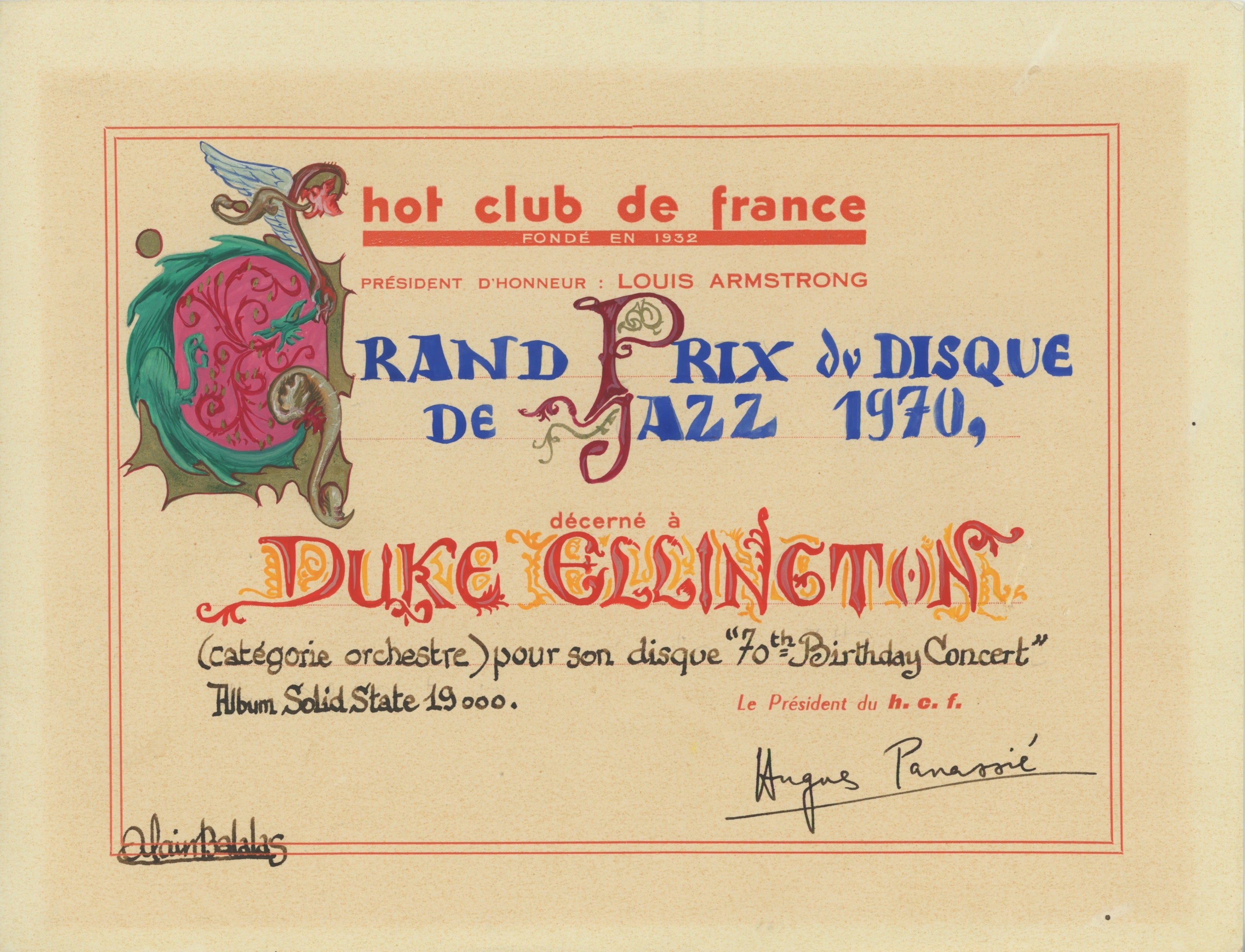 [Ellington, Duke. (1899-1974)] Panassié, Hugues. (1912-1974). Hand-Painted Grand Prix du Disque Award Certificate From the Hot Club. Beautifully hand-lettered and illuminated certificate from the Hot Club de France, awarding Duke Ellington the Grand Prix du Disque de Jazz 1970 for his "70th Birthday Concert" recording. Signed by the founder of the Hot Club, influential jazz producer and critic Hugues Panassié. Provenance: Duke Ellington Estate. Light toning within a rectangular border; overall in fine condition. 11 x 8.5 inches (27.7 x 21.3 cm).