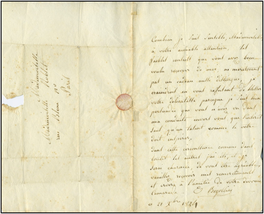 Bigottini, Émilie. (1784-1858). Autograph Letter to Lise Noblet. A very fine autograph letter from one celebrated dancer to another. Addressed to Mlle. Noblet and dated 1824. Interesting content, regarding their friendship and, apparently, Noblet's request to Bigottini for career or artistic advice.