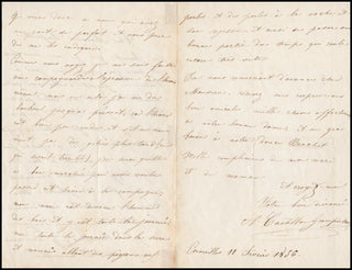 Castellan-Giampietro, Anaide. (1821 - 1868). Autograph Letter to Alexis Dupont. Rare autograph letter from the great soprano to the important tenor, Alexis Dupont (1796-1874). 3 integral pages, dated 11 February 1856. In fine condition. In French, excusing herself after a period of absence ("En hermite que je me suis faite cet hiver j'ai remis d'un jour a l'autre le projet d'aller voir votre amiable dame et ma chere petite Marie que j'aime tant et jus qu'a present je n'ai peu mettre en projet a execution") and discussing the winter she has passed in the countryside ("mon mari est devenu l'homme des bois et y est toute la journee"). She asks her friend if he can suggest some recently composed Romances because he stays more up-to-date with such matters ("Une dame de Lisbonne me demande les titres d'une demie douzaine de jolies Romances; je n'en connais aucune surtout des nouvelles. Je viens donc a vous qui avez un gout si parfait, et vous prie de me les indiquer. Comme vous voyez je me suis faite une campagnard a l'epreuve de l'hiver meme...").
