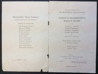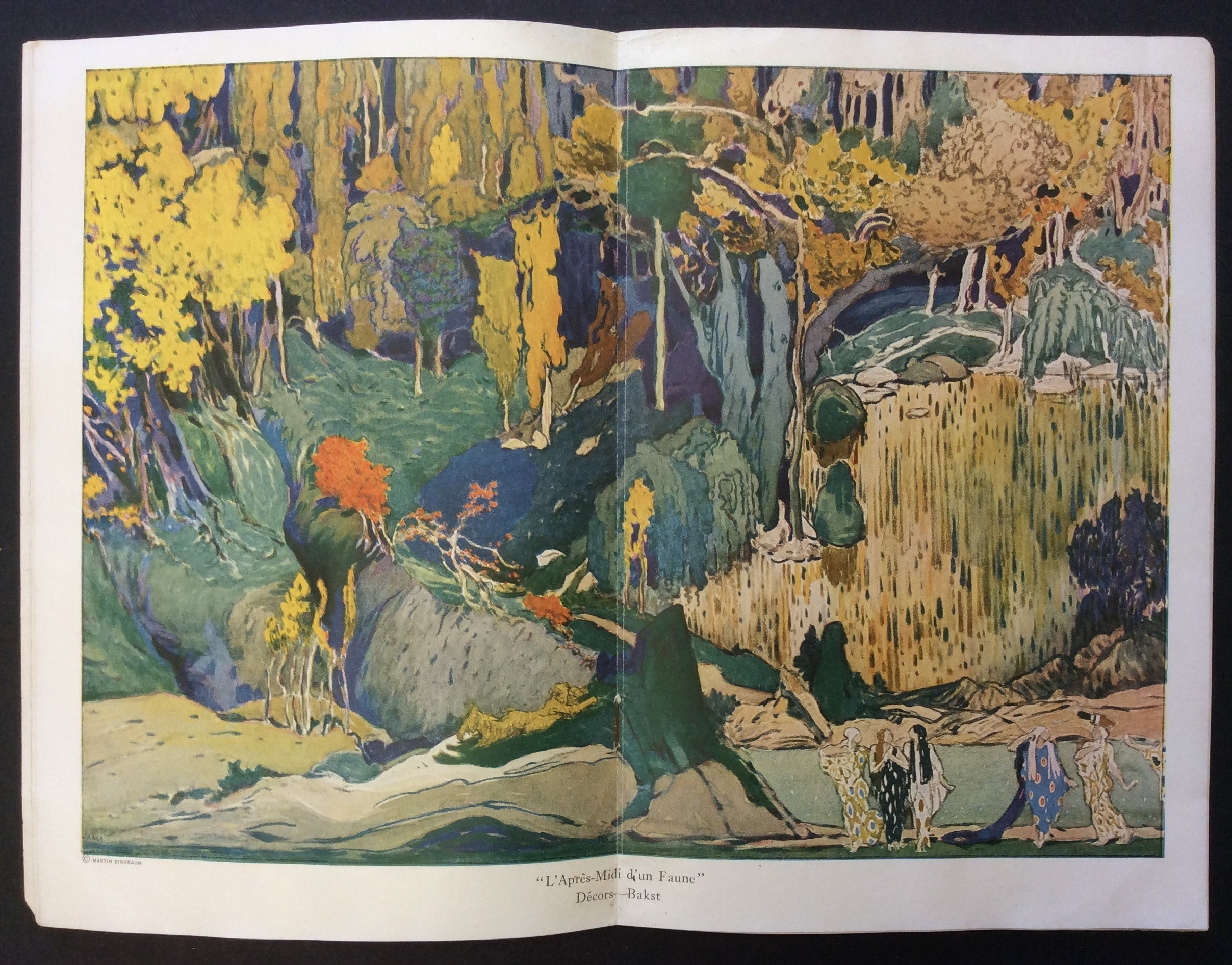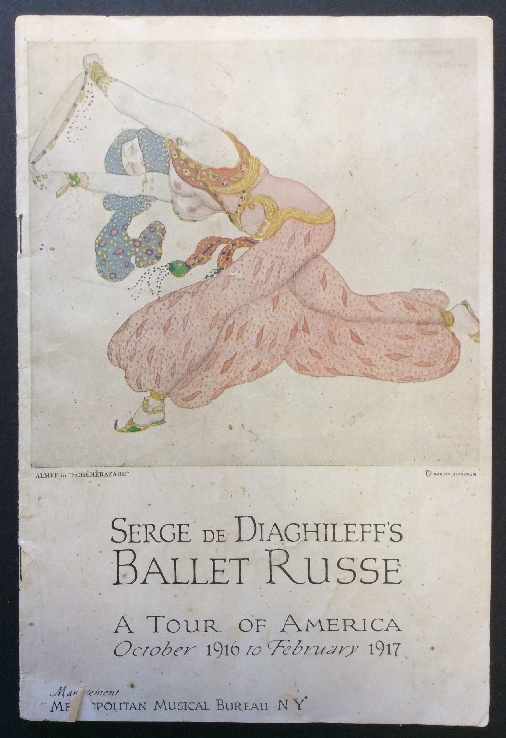 [Ballets Russes]. Original 1916 Tour Program. Rare original prospectus program from the 1916 - 1917 US tour of Diaghilev's Ballets Russes. The present program includes photographs of some of the principle dancers, including Nijinsky, as well as a magnificent two-page lithograph of Leon Bakst's set for "L'Apres-Midi d'un Faune." This particular program is from one of the two shows held at the Lyric Theater in Baltimore, Fri-Sat, November 17 & 18, 1916. 22 pp. Light foxing to the wrappers; spine slightly split with one corner tear; one vertical crease; overall in very good condition. 6 x 9 inches (15.4 x 23 cm).