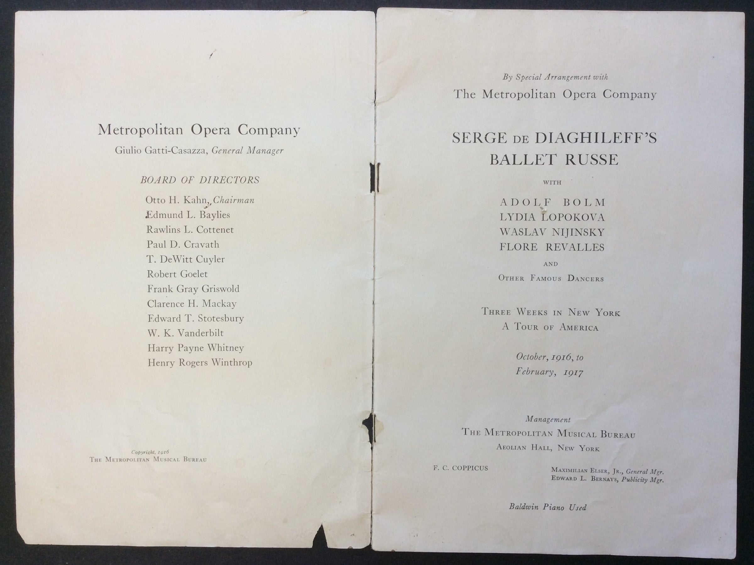"For the first US tour, earlier in 1916, Diaghilev had succeeded in having Nijinsky released from his internment for mental health problems, and though he arrived on that tour later than the rest of the company, he was an enormous sensation on the tour. "When that first American season was over, Otto Kahn, the chairman of the Metropolitan Opera board, engaged the Ballets Russes for a second New York season, to be followed by a cross-country tour (1916-1917), and he unwisely decided that the company should be directed during this period by Nijinsky, not Diaghilev. What followed was probably the most chaotic and demoralized tour the Ballet Russes ever undertook. A four-month journey, stopping in fifty-two cities, with over a hundred dancers and musicians: it was a huge administrative assignment, and Nijinsky had no administrative skills....After this dreadful tour, on which the Metropolitan Opera lost a quarter of a million dollars, Nijinsky performed with the Ballets Russes for a few months more, in Spain and South America, in 1917." (Joan Acocella, "Secrets of Nijinsky." NY Rev. of Books, Vol. 46, 1999).