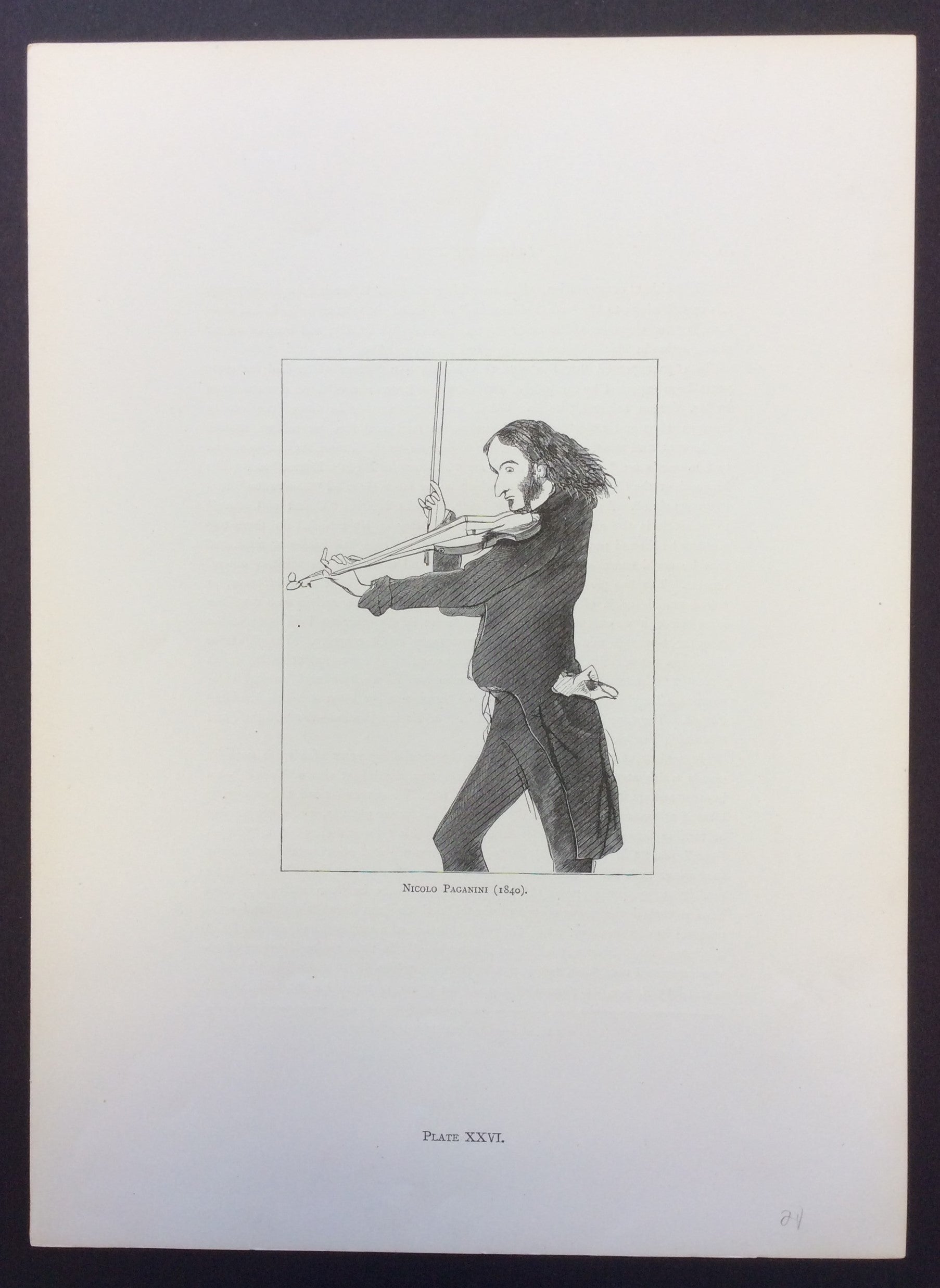 Landseer drew an initial sketch of Paganini from memory shortly after seeing the maestro play at a salon given by Marguerite, Countess Blessington in 1831. He later drew a more finished version of the image, from which prints could be made. Capturing Paganini's wild hair, long fingers and dashing playing style, it has remained one of the most recognizable images of the violinist.