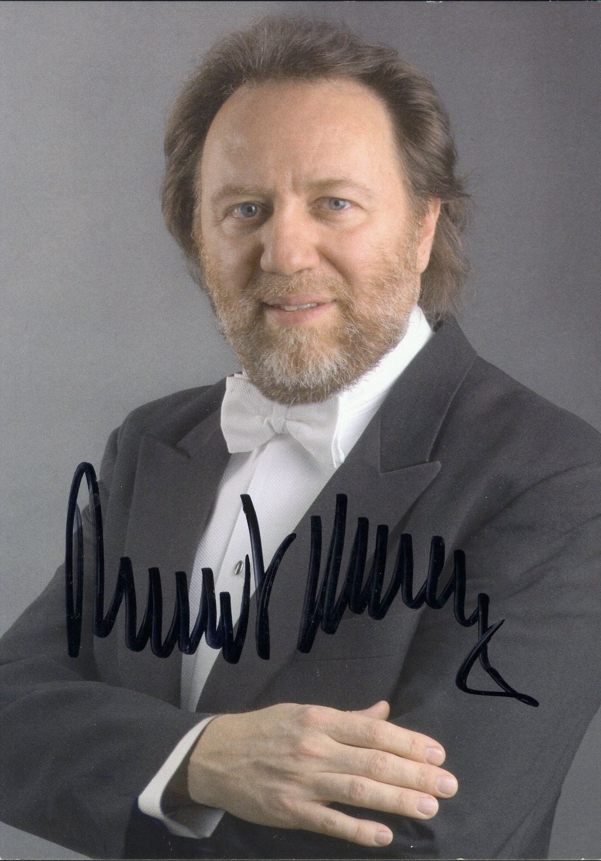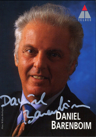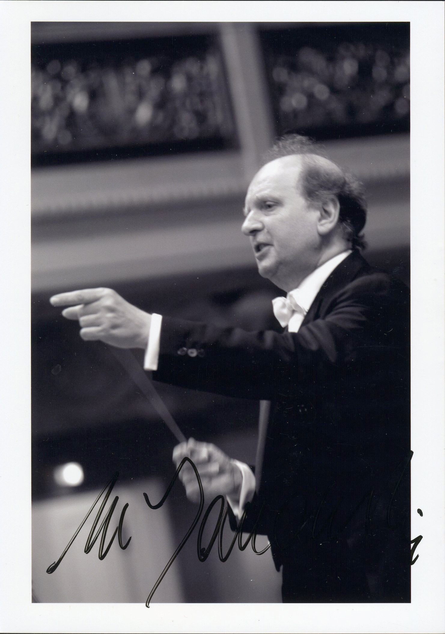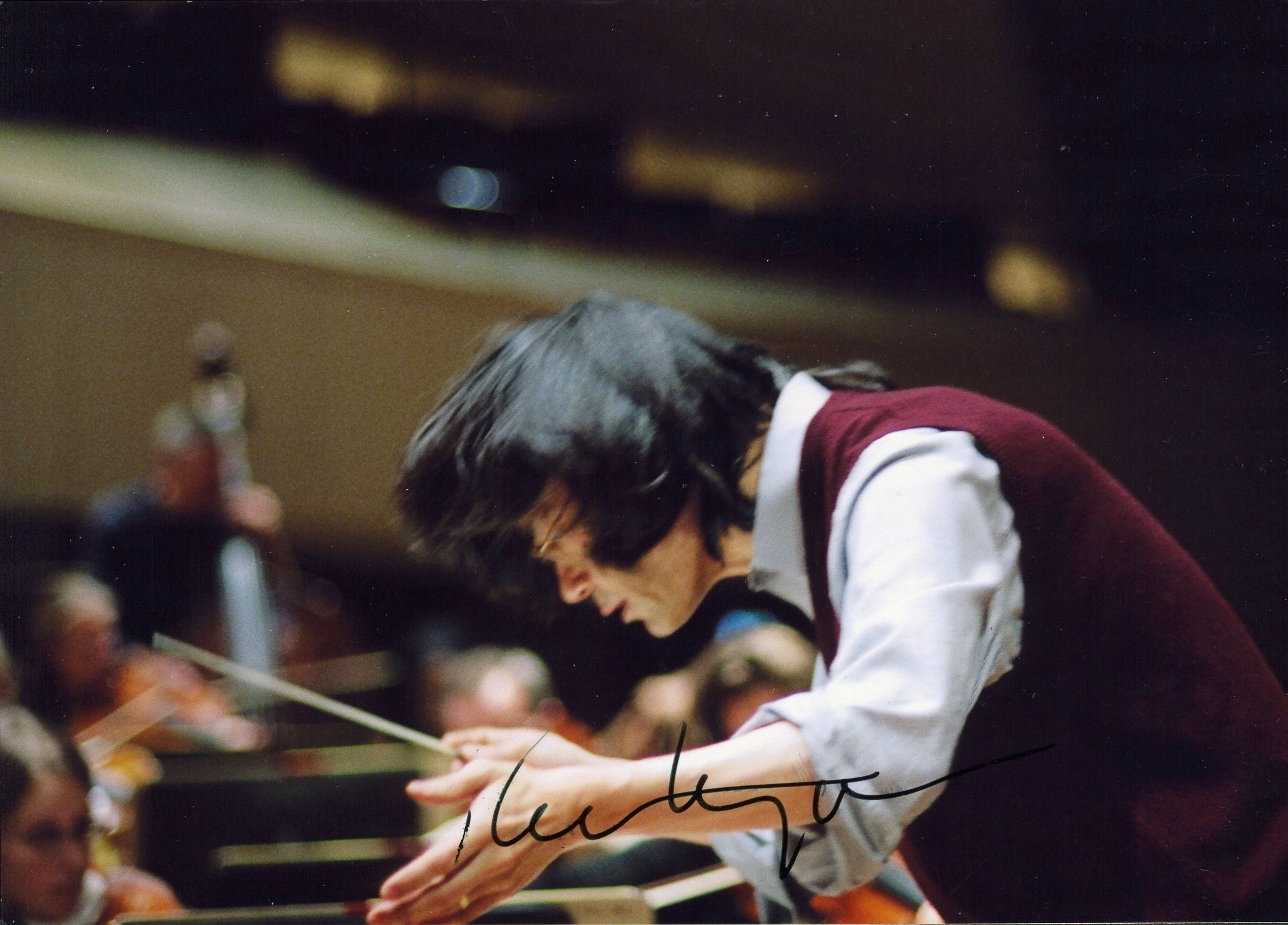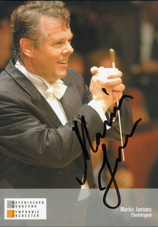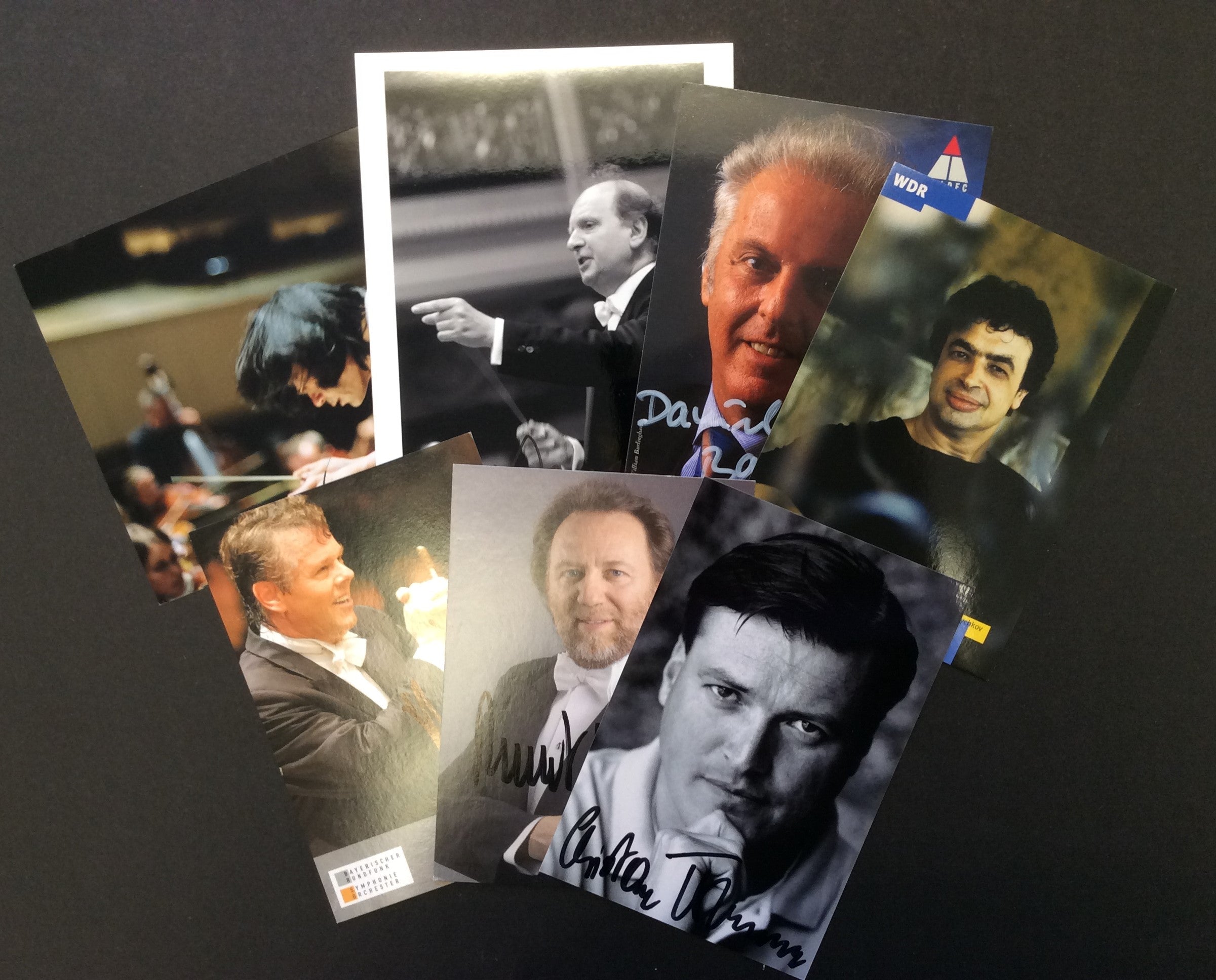 Small collection of seven boldly signed glossy promotional photographs or photograph postcards of some of today's most influential conductors: Kent Nagano, Marek Janowski, Daniel Barenboim, Semyon Bychkov, Christian Thielemann, Riccardo Chailly, and Mariss Jansons. Ranging in size from 4 x 6 to 5 x 7 inches, all in very fine condition.