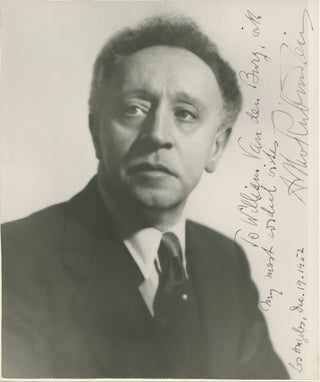 Rubinstein, Arthur. (1887–1982) [van den Burg, Willem. (1901–1992)]. Signed Photograph to Willem van den Burg. 8 x 10 inch halflength portrait photograph of the great pianist, signed and inscribed in 1952 to the cellist Willem van den Burg. Mounted to rigid backing, otherwise in fine condition.