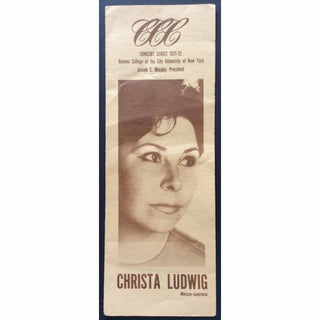 An attractive signed program from the distinguished mezzo-soprano's 1972 recital at Queens College, New York. Ludwig is pictured on the sepia-toned narrow format program, and has signed boldly on the inside cover. Some wrinkling; overall in very good condition. 5 x 14 inches (12.7 x 35.5 cm).