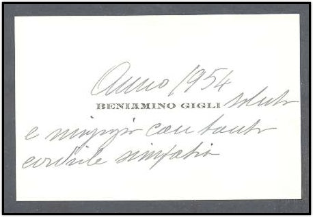 Gigli, Beniamino. (1890-1957). Inscribed Visiting Card. From the great honey-voiced tenor. Inscribed in 1954, together with the original transmissal envelope. 2.75 X 4.25 inches.