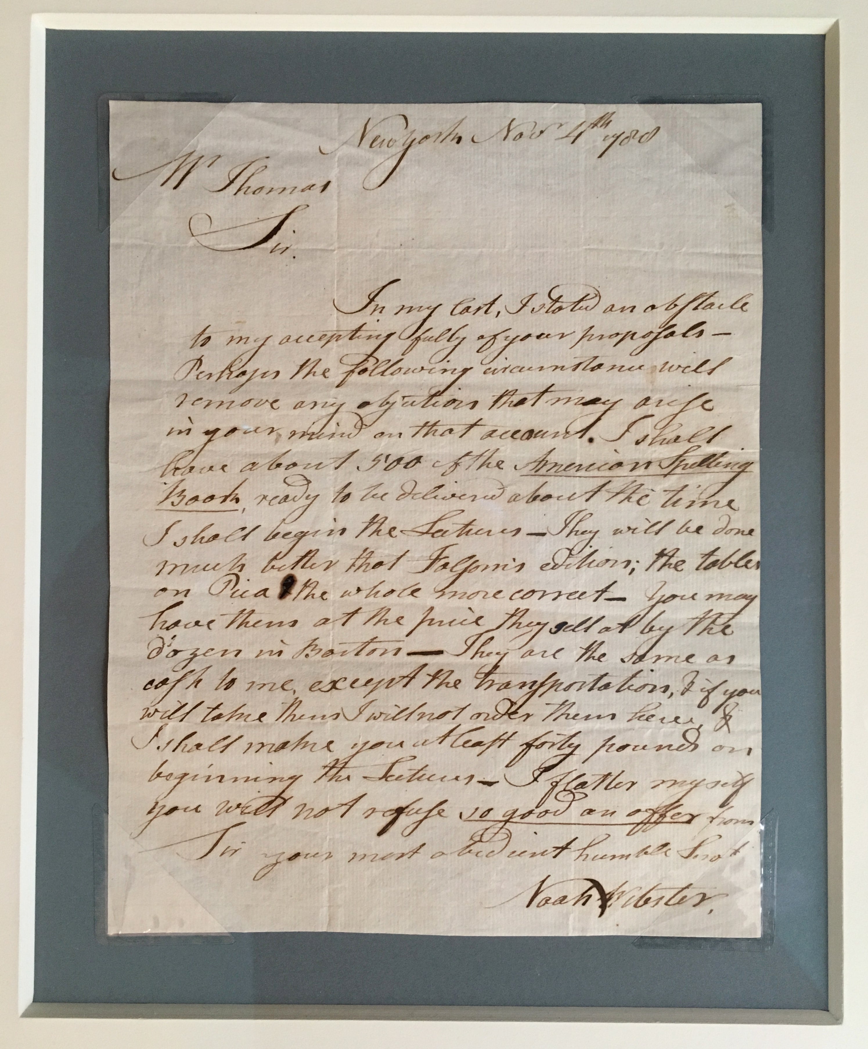 Best known for his compilation of the American English dictionary, Webster was also famous in his day for The American Spelling Book. This book, first published in 1783, was a very popular textbook for young children and by the end of the 19th century, it had sold an astonishing 100 million copies. It not only taught students how to read and spell, but also provided lessons on subjects such as morality and the principles of American government. This last was particularly close to the heart of Webster's work, for through his dictionary, speller, and other educational work, he hoped to create a distinctly American culture and language. Through its many editions, Webster contracted with local publishers to make copies for their regions. The present letter is addressed to the publisher of the version printed in Boston. (Joshua Kendall, The Forgotten Founding Father: Noah Webster's Obsession and the Creation of an American Culture (New York: G.P. Putnam's Sons, 2010), p. 7; 74-75; 92-93)