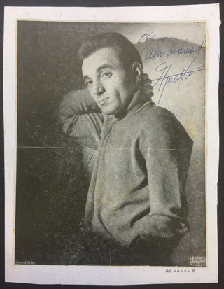 Halftone photograph of the great French-Armenian singer as a young man, signed twice in the lower left and upper right corners (the signature in the lower left with poor contrast.) Photographed by A. Bellan for Studio Hollywood. Mounted on white card and unevenly trimmed. Folding crease, foxing, and overall wear; otherwise in very good condition. 6.75 x 8.5 inches (17 x 21.8 cm), mounted to 7.5 x 9.5 inches (19 x 24.5 cm).