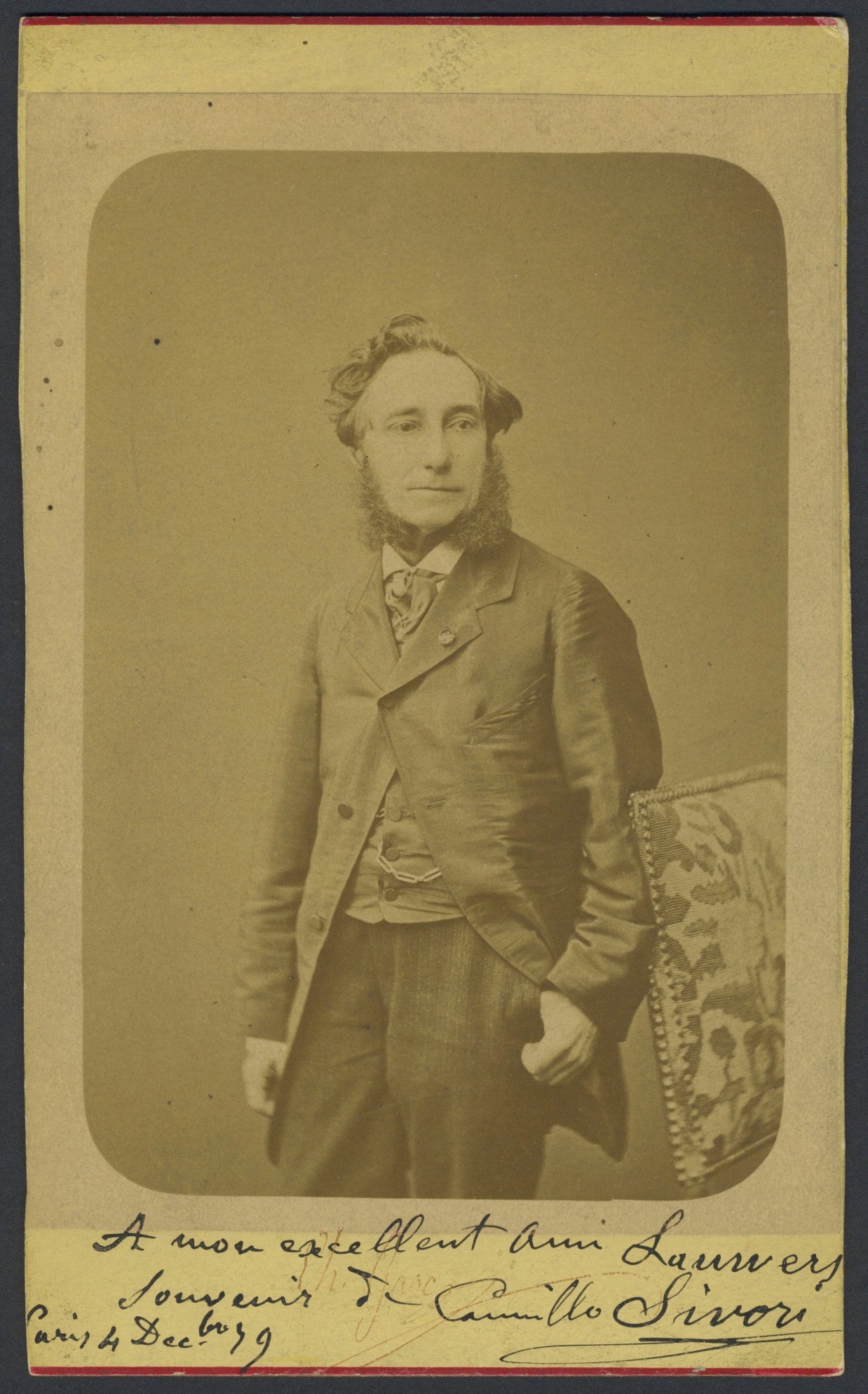 Signed photograph of the important virtuoso violinist, Paganini's only pupil, who introduced Mendelssohn's Violin Concerto in England in 1827 at age 12, collaborated with Liszt and composed virtuoso arrangements of many works. He has inscribed the portrait photograph (translated from the French): "To my excellent friend Lauwers / Souvenir of Camillo Sivori / Paris, December 4, 1879." Slightly irregularly trimmed, with overall toning; otherwise in fine condition. 4 x 6.5 inches (10 x 16.3 cm).