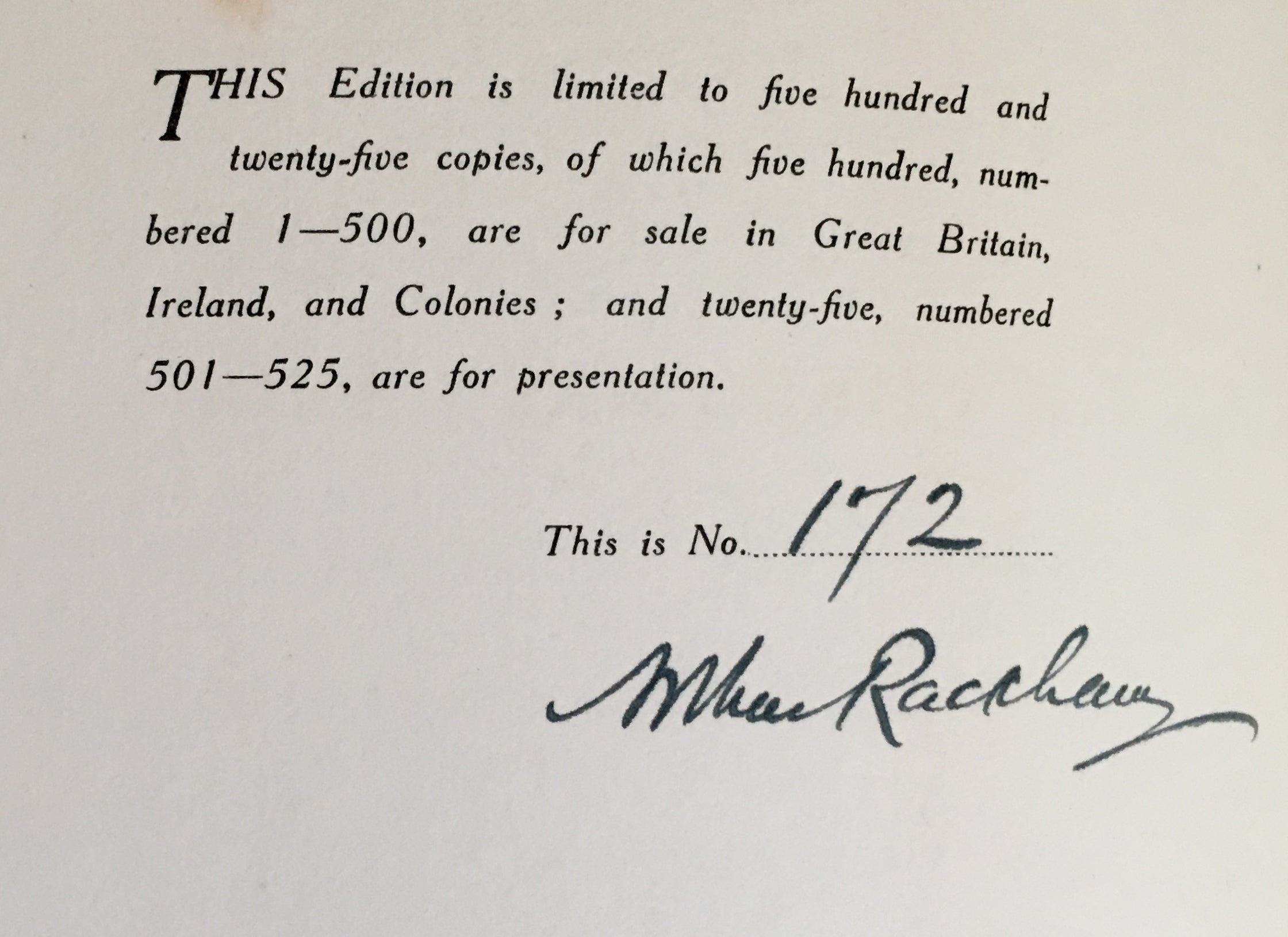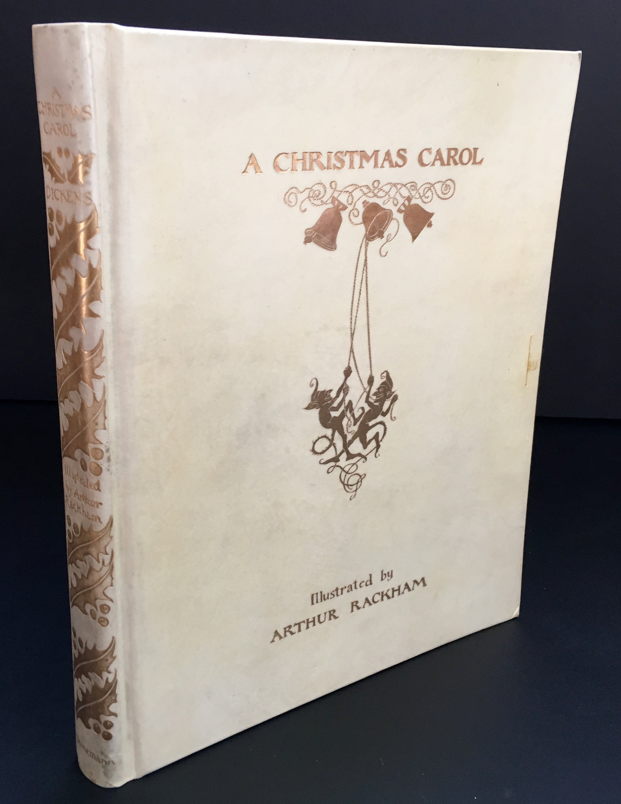 Large quarto. Original full vellum, titles and pictorial decoration to spine and front board and top edge gilt, others untrimmed, pictorial endpapers, silk ribbon ties lacking (one laid in). Signed limited edition, number 172 of only 525 copies, of the “Bible of Christmas,” with tipped-in colour frontispiece and 11 plates on grey paper with printed tissue-guards, and 20 in-text line cuts by Rackham and signed by him.