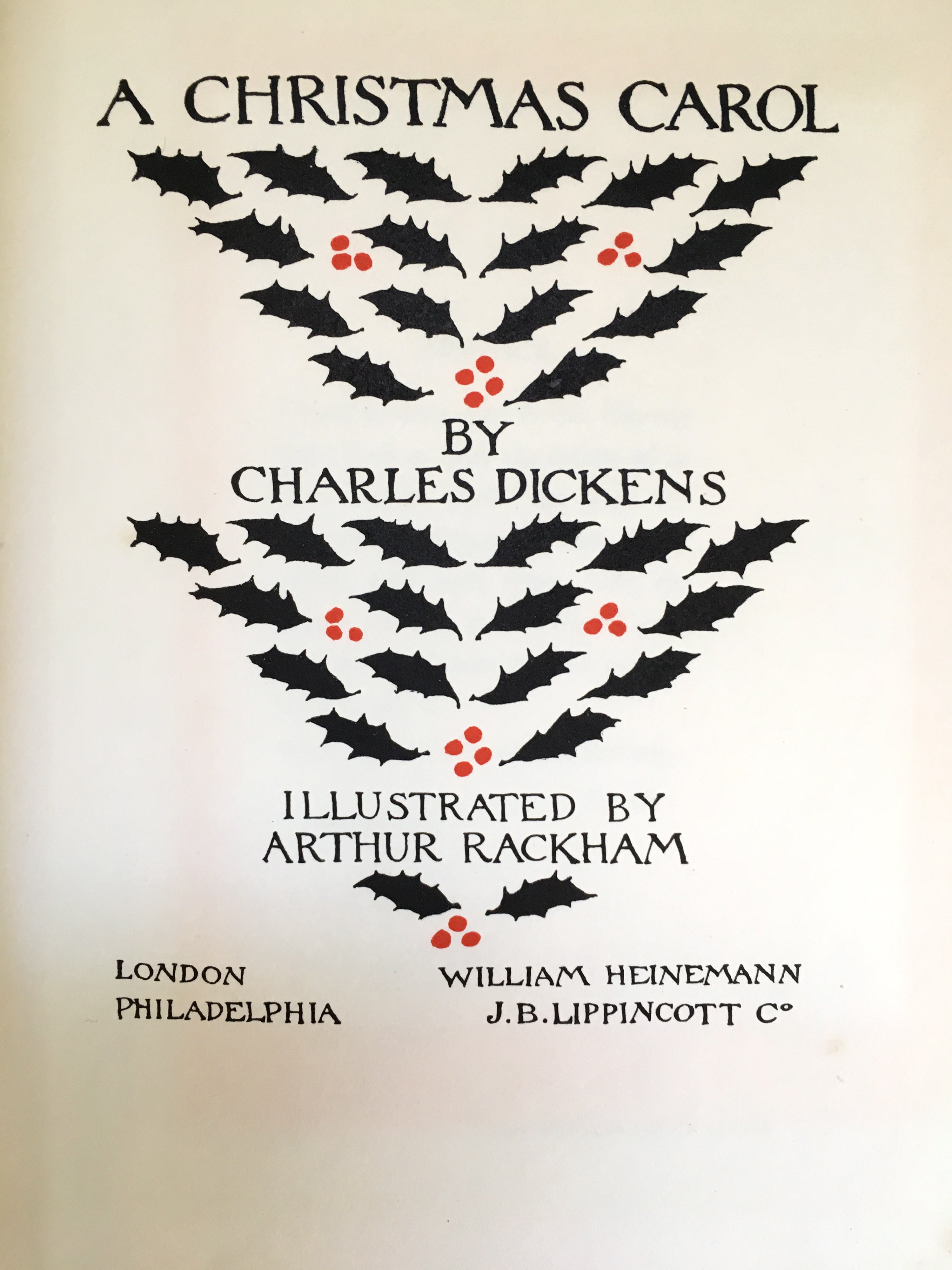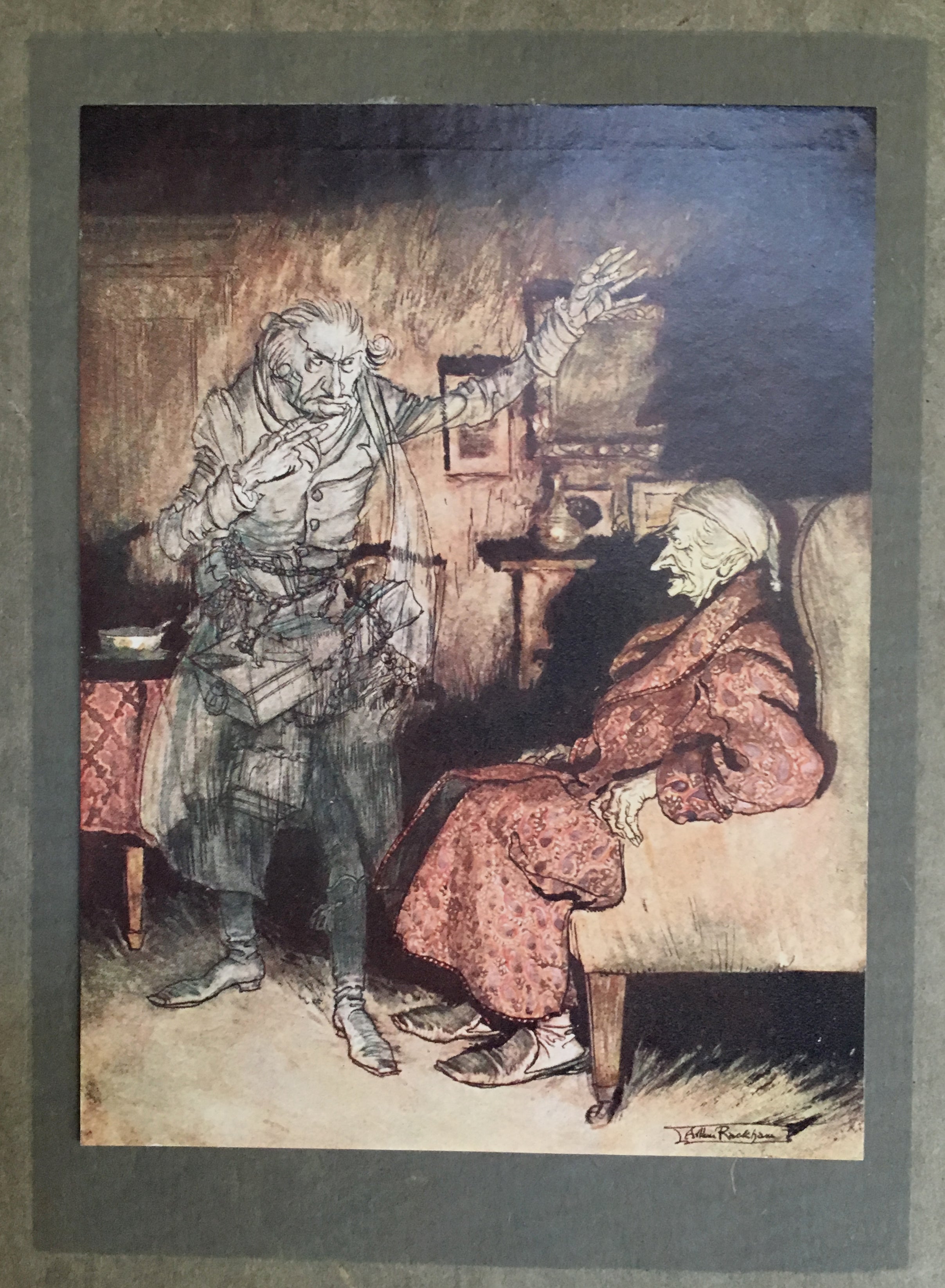 “The Christmas gift-book proved an excellent market for Rackham. His sensitive and agile line earned him the appreciation of connoisseurs, while his care for the spirit of each text commended him alike to children and adults” (DNB). A Christmas Carol marks the first time Rackham illustrated Dickens’ work. Dickens’ Carol was first published in 1843 and “may readily be called the Bible of Christmas” (Eckel, 110). Latimore & Haskell, 44-45. Riall, 124.