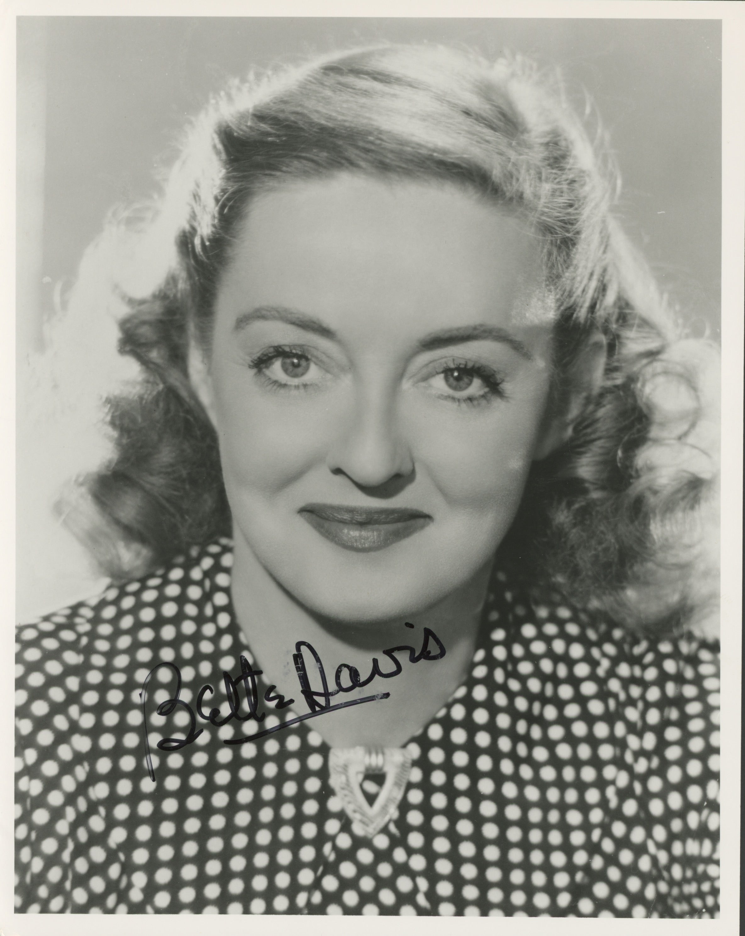 Signed photograph of the great Hollywood actress, smiling in a 1940's-era studio portrait. Davis has signed boldly across the image. 8 x 10 inches.