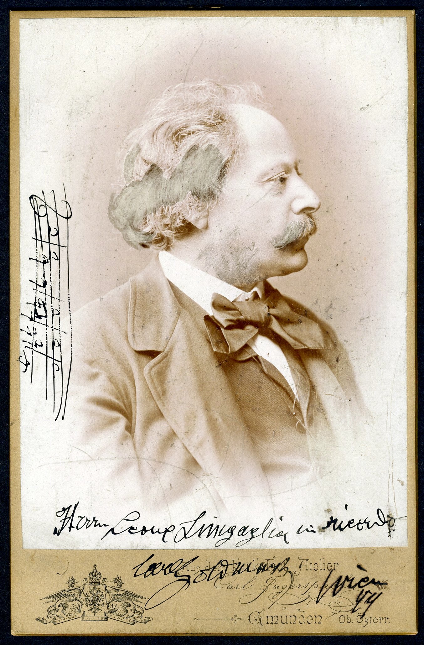 Signed cabinet photograph of the important Hungarian-born Viennese composer, inscribed to the Italian composer Leone Sinigaglia with an autograph musical quotation from Goldmark's best-known work, Die Königin von Saba. Goldmark has signed and inscribed to Sinigaglia at the foot of the photograph, dated Vienna [18]99, and penned the first five measures of the overture to the opera along the left edge. Photographed by Carl Jagerspacher of Gmunden. Some areas of discoloration to the image, with surface scratches, and some smudging to the inscription; mounting remnant on the verso; otherwise overall in very good condition. 4.25 x 6.5 inches (11 x 16.8 cm).