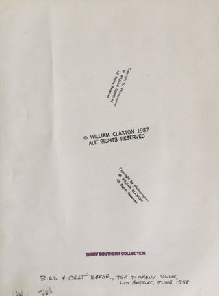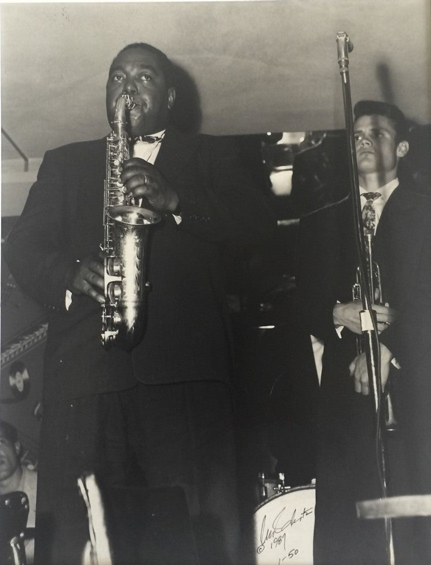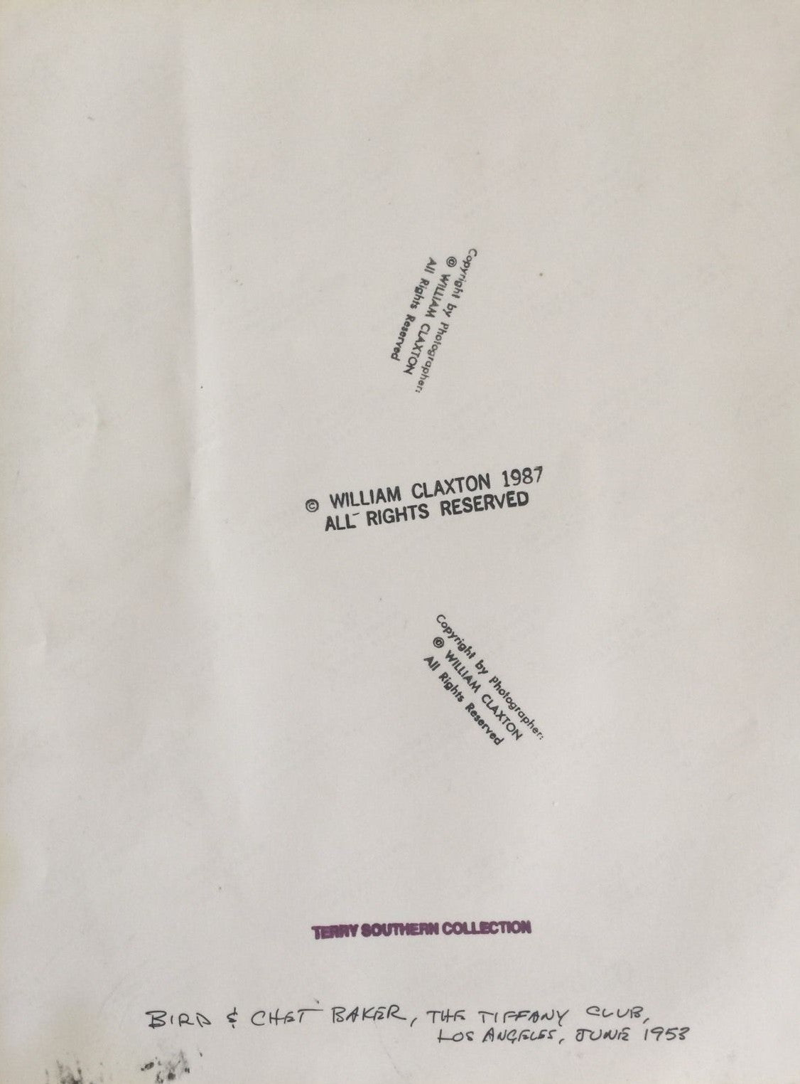 [Baker, Chet. (1929-1988) & Parker, Charlie. (1920-1955)] Claxton, William. (1927-2008). Original 1953 Photograph, Signed by Claxton. An iconic original photograph of Charlie Parker performing with a young Chet Baker, by the important American photographer William Claxton, noted for his portraits of jazz musicians. Photographed in 1953 at the Tiffany Club in Los Angeles, "Bird" is shown playing, while Chet holds his horn and listens with concentration in the background. Silver gelatin print, printed in 1987, signed by Claxton on the image and numbered as 1 of a run of 50, and also stamped by Claxton on the verso. From the collection of Terry Southern. 11 x 14 inches. Matted.