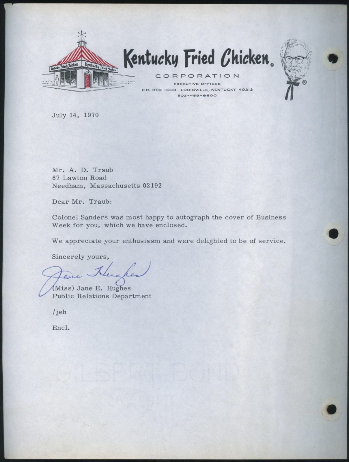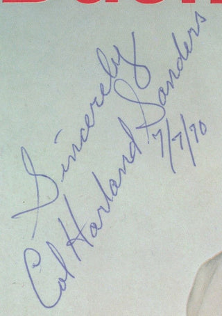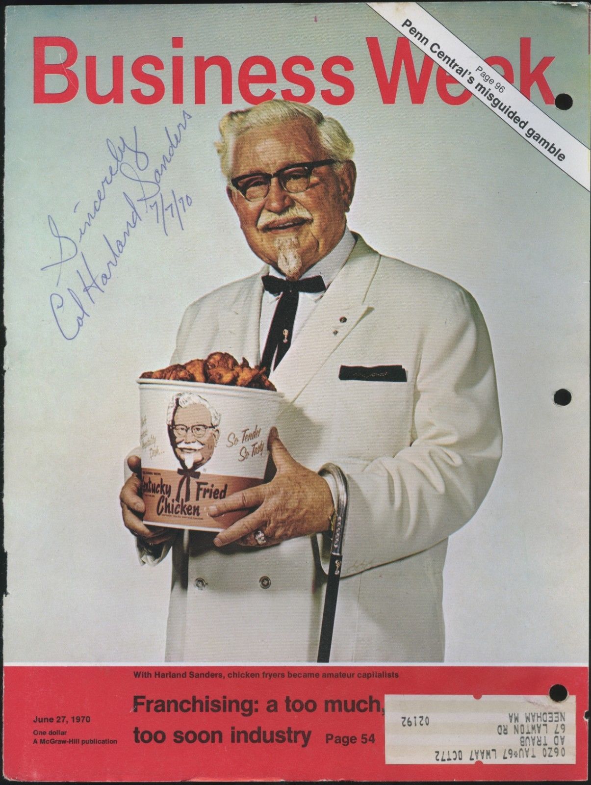 Sanders, Colonel Harland David. (1890-1980). Signed Magazine Cover. An original 1970 cover from Business Week magazine, autographed by the ribbon-tie-and-white-suit-wearing fried chicken tycoon. He is shown in his trademark white suit, holding a bucket of chicken. Sanders has dated July 7, 1970, on the magazine cover dated June 27, 1970. Together with a typed letter signed from the Public Relations department of Kentucky Fried Chicken, enclosing the signed cover. A surprisingly scarce autograph from the American businessman, who remains a recognizable brand ambassador and cultural symbol. Left edge a little rough, hole punched at the right hand edge, else fine. 8.5 x 11 inches.