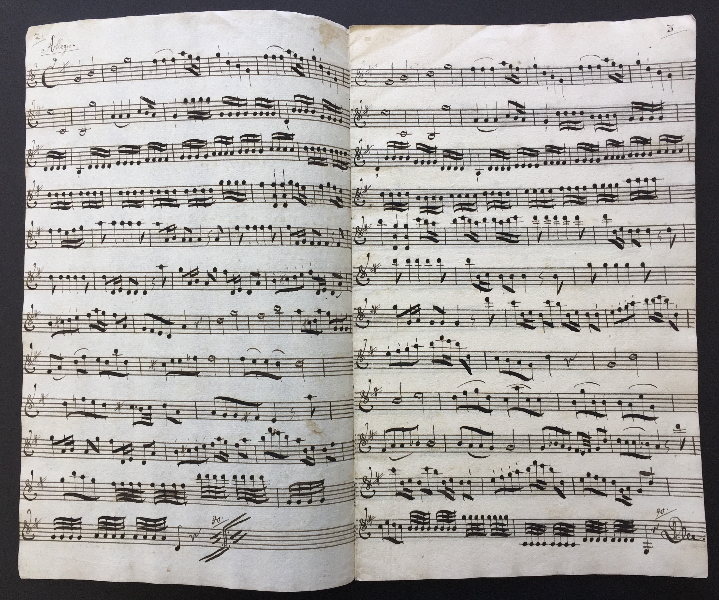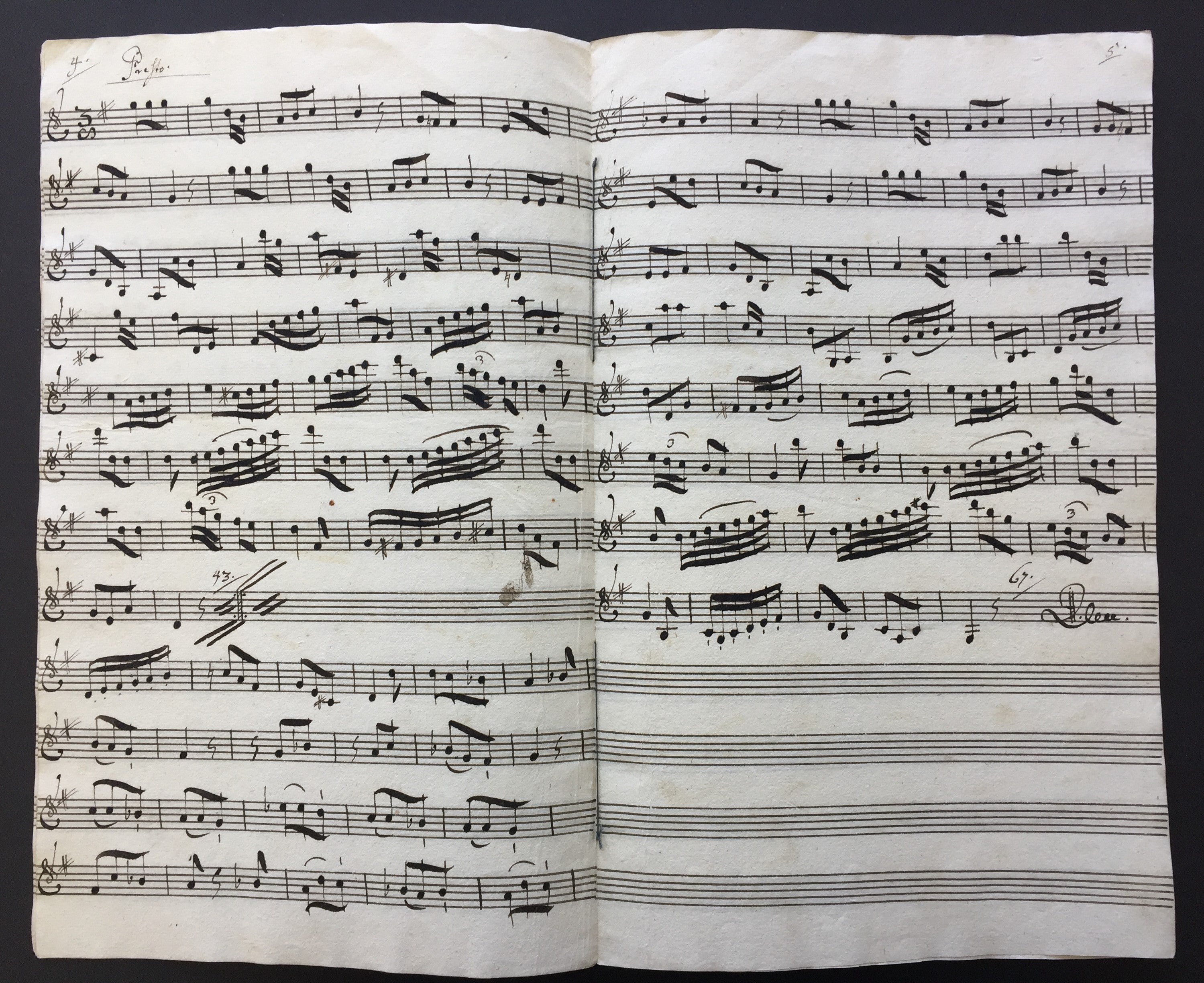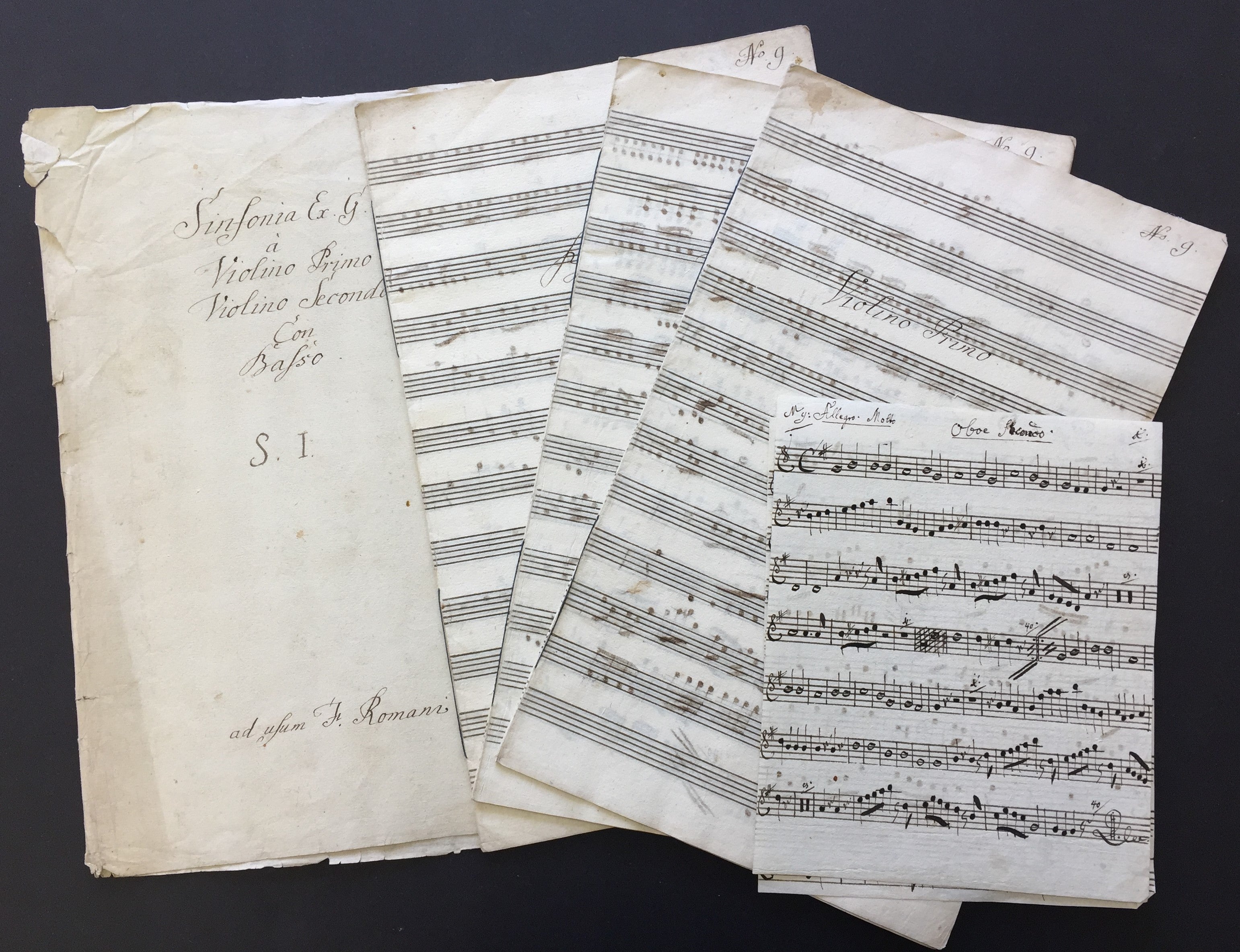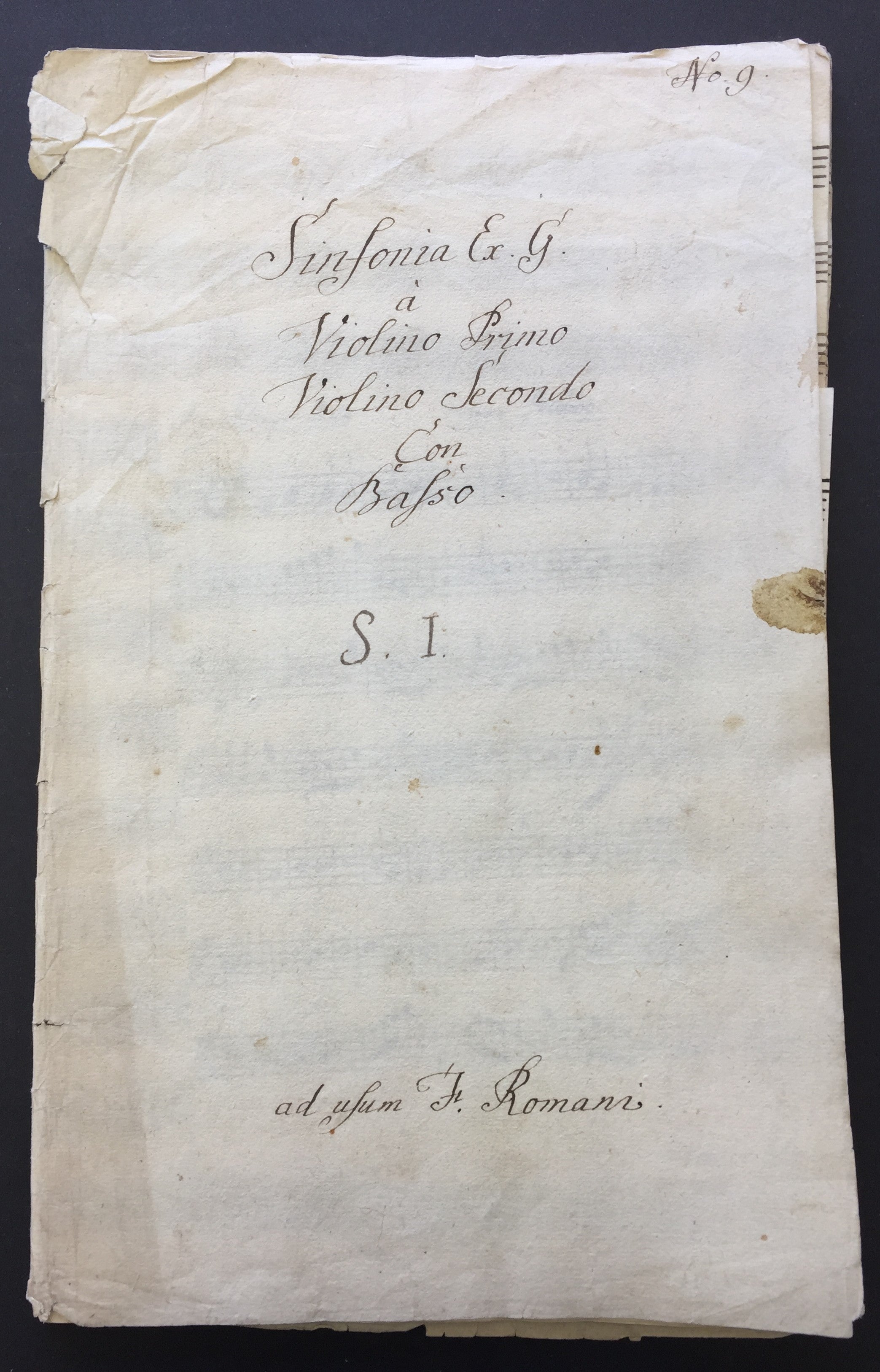 [Romani, Felice. (1788-1865)]. Sinfonia Ex. G. à Violino Primo, Violino Secondo, con Basso, S. I. ad usum F. Romani. - Copyist Manuscript. Set of manuscript parts, in a copyist's hand, for a chamber work of two movements for two violins, two oboes and bass, likely dating from early 19th-century Austria or southern Germany. By an unidentified composer, apparently with the initials S. I. as shown on the title page. Five parts (including the three string parts given in the title and also two further parts for two oboes in the same hand) as follows: Violino I (5 pp); Violino II (5 pp); and Basso (5 pp), all folio; Oboe I (2 pp) and Oboe II (2 pp), 4to. Unbound. Each part also marked as "No. 9" and copied throughout in a bold, clear manuscript hand. The work is in two movements, "Allegro" and "Presto." Heavy wear and some tearing to the title page; overall toning and ink bleed-through, but otherwise highly legible and in very good condition.