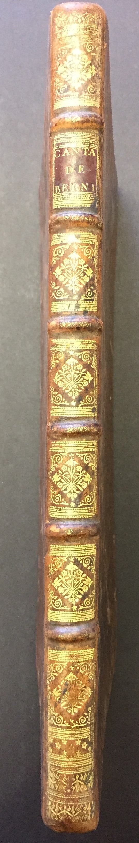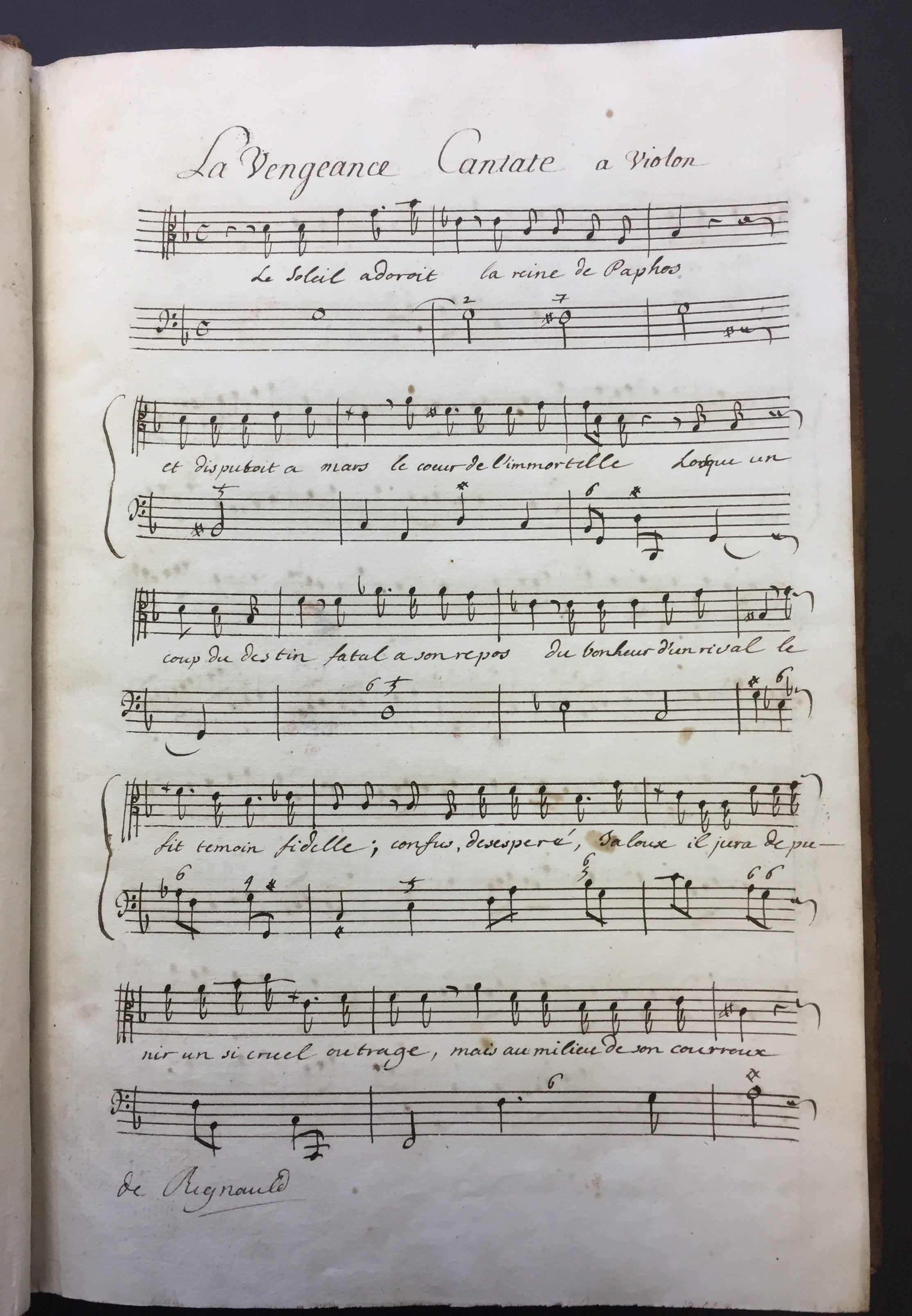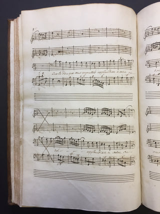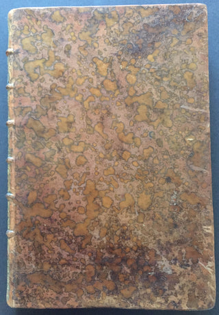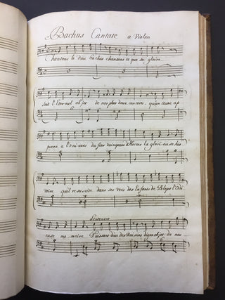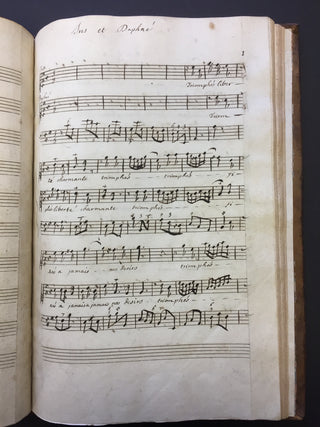 A handsomely bound volume of copyist manuscripts of secular cantatas by the French Baroque composer known as one of the creators of the French cantata genre. The volume contains four solo and duo cantatas, some with violin. The first of the four cantatas does not appear in literature on Bernier and may be the work of a Regnauld or Rignauld. Contents as follows: La Vengeance (for solo alto and violin on a text by Jean-Baptiste Rousseau titled "Les Filets de Vulcain", 31 pp.); Bacchus (for solo bass and violin, published in Bernier's fourth volume of cantatas in 1703, 33 pp.); Iris et Daphné (for two sopranos, published as Les Nimphes de Diane in 1703, 37 pp.); and Jupiter et Europe (for soprano and bass with two violins, also published in Bernier's fourth volume of cantatas, 51 pp.) All cantatas are written in a bold, clear hand throughout, with some evidence of more than one copyist's hand. Full brown leather with gilt decoration to the spine and edges of the boards, partially worn off; spine label reads "Canta de Berni." Marbled endpapers. Slight splitting at the rear gutter, but overall sound and in fine condition. 10 x 15 inches (25.5 x 38.3 cm).