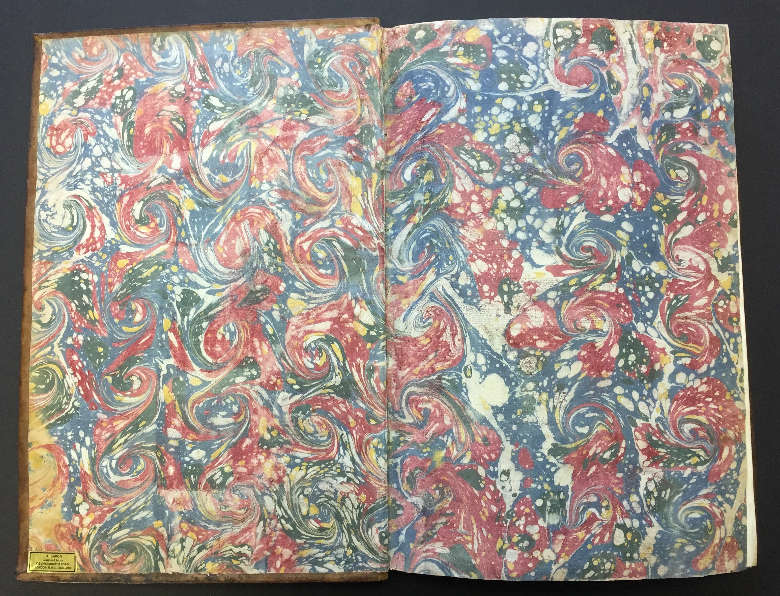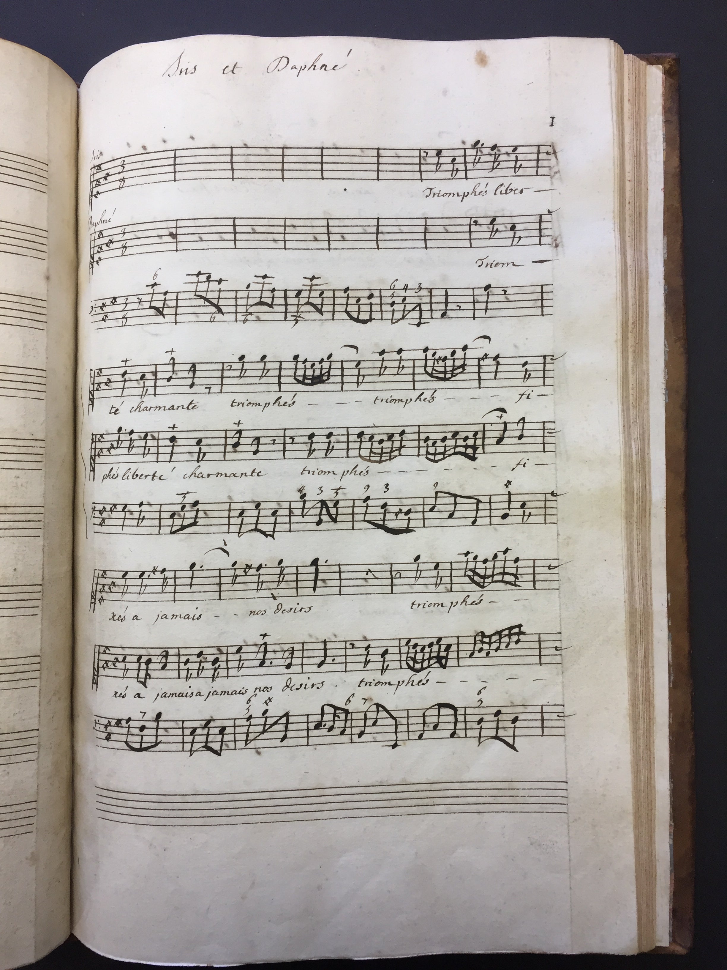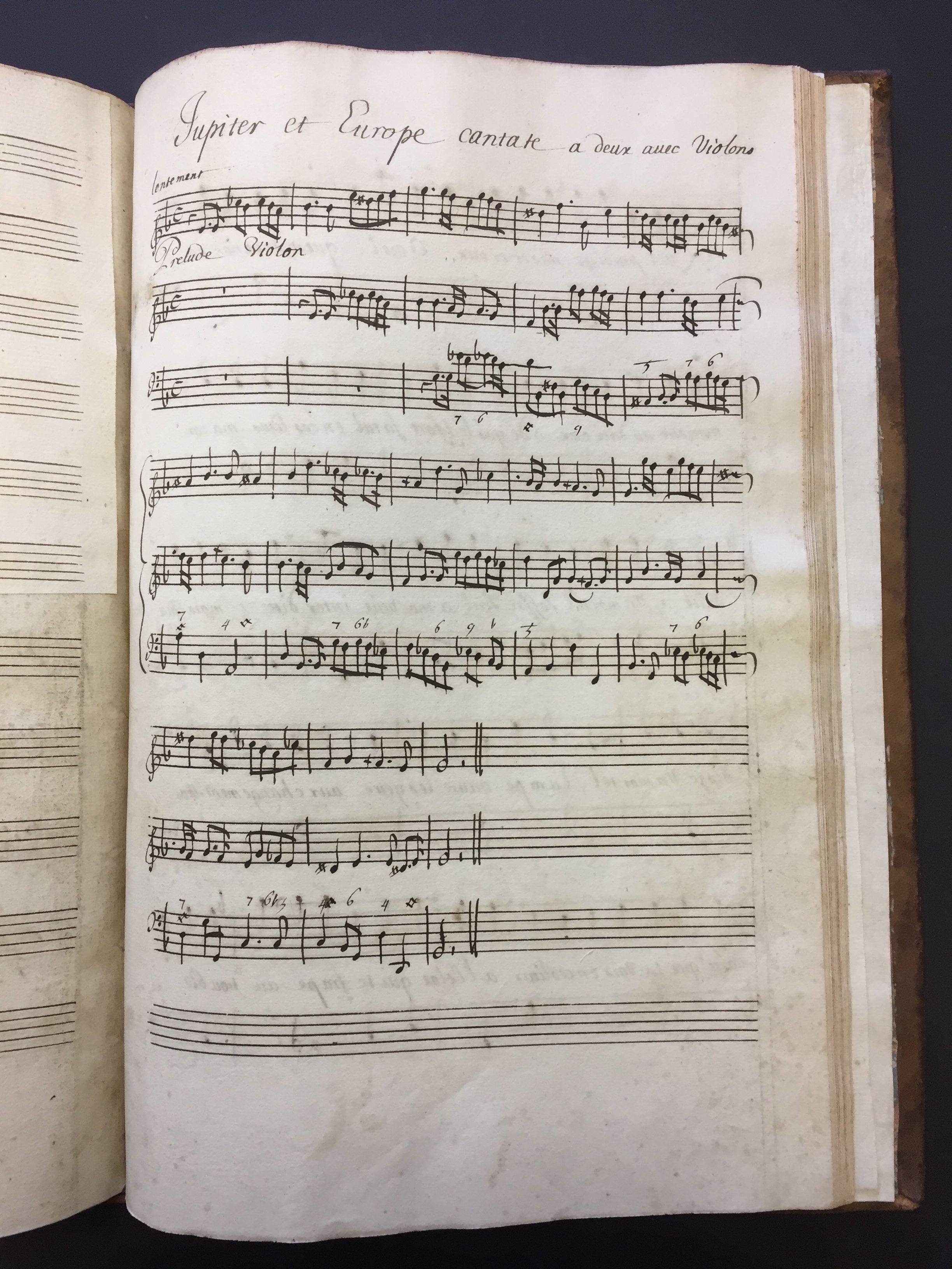 A handsomely bound volume of copyist manuscripts of secular cantatas by the French Baroque composer known as one of the creators of the French cantata genre. The volume contains four solo and duo cantatas, some with violin. The first of the four cantatas does not appear in literature on Bernier and may be the work of a Regnauld or Rignauld. Contents as follows: La Vengeance (for solo alto and violin on a text by Jean-Baptiste Rousseau titled "Les Filets de Vulcain", 31 pp.); Bacchus (for solo bass and violin, published in Bernier's fourth volume of cantatas in 1703, 33 pp.); Iris et Daphné (for two sopranos, published as Les Nimphes de Diane in 1703, 37 pp.); and Jupiter et Europe (for soprano and bass with two violins, also published in Bernier's fourth volume of cantatas, 51 pp.) All cantatas are written in a bold, clear hand throughout, with some evidence of more than one copyist's hand. Full brown leather with gilt decoration to the spine and edges of the boards, partially worn off; spine label reads "Canta de Berni." Marbled endpapers. Slight splitting at the rear gutter, but overall sound and in fine condition. 10 x 15 inches (25.5 x 38.3 cm).