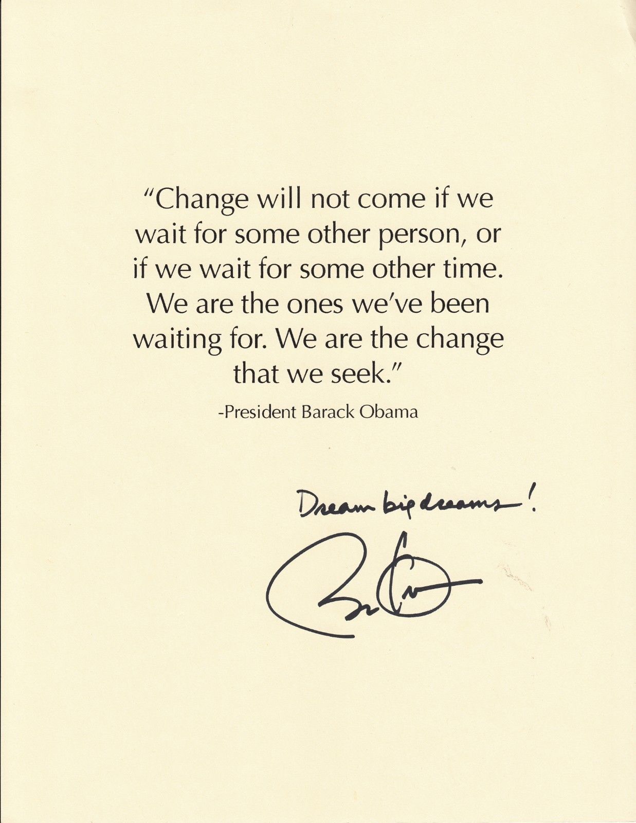 Autograph signature from the 44th President, inscribed with the autograph exhortation to "Dream big dreams!" on a printed copy of a quotation from one of his memorable 2008 campaign speeches. The quotation, from a speech given in Chicago on Super Tuesday (February 5), 2008, reads: "Change will not come if we wait for some other person, or if we wait for some other time. We are the ones we've been waiting for. We are the change that we seek." Obama has signed boldly in sharpie below the quotation. On card stock, 8.5 x 11 inches.