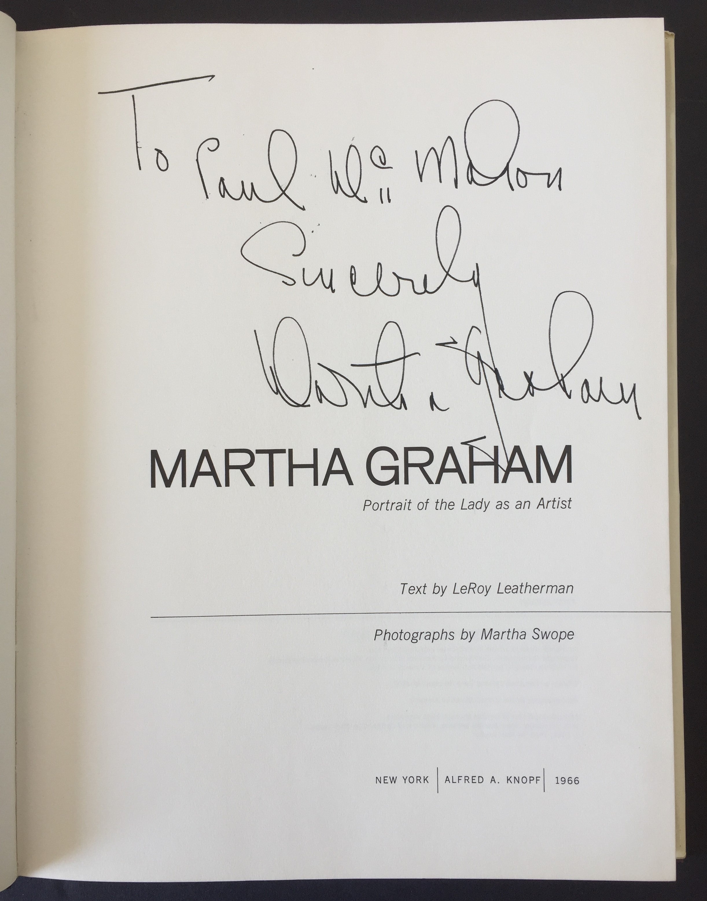 Graham, Martha. (1894–1991) [Leatherman, LeRoy. (1922–1984) & Swope, Martha. (1928–2017)]. Martha Graham: Portrait of the Lady as an Artist - SIGNED. New York: Alfred A. Knopf. 1966. First. Signed book from the pioneering American modern dancer and choreographer. Graham has boldly signed and inscribed on the title page to Paul McMahon. The volume includes many black & white photographs throughout. 182 pp. In very fine condition with fine dust jacket. 8.5 x 11 inches (22.5 x 28.5 cm).