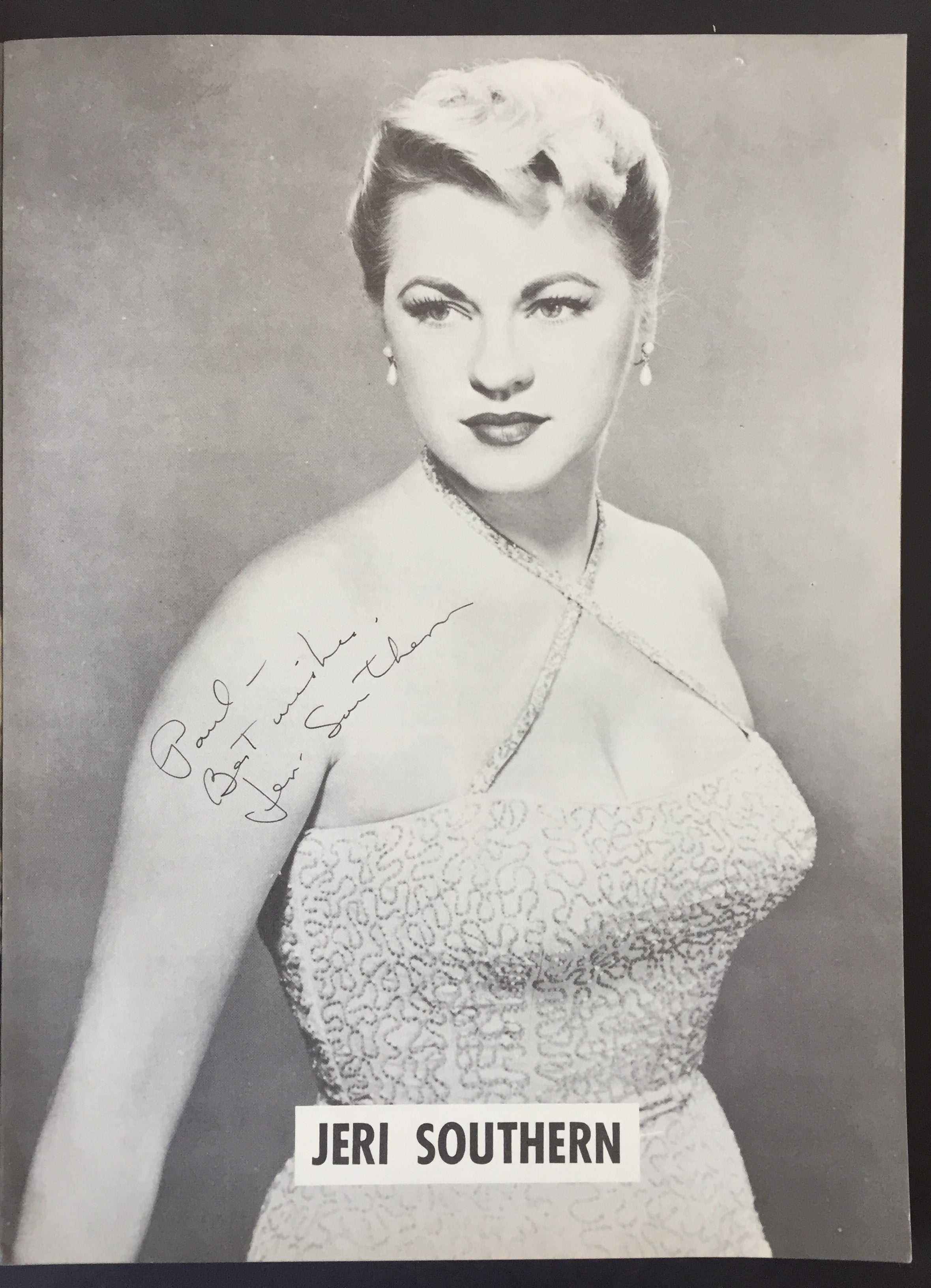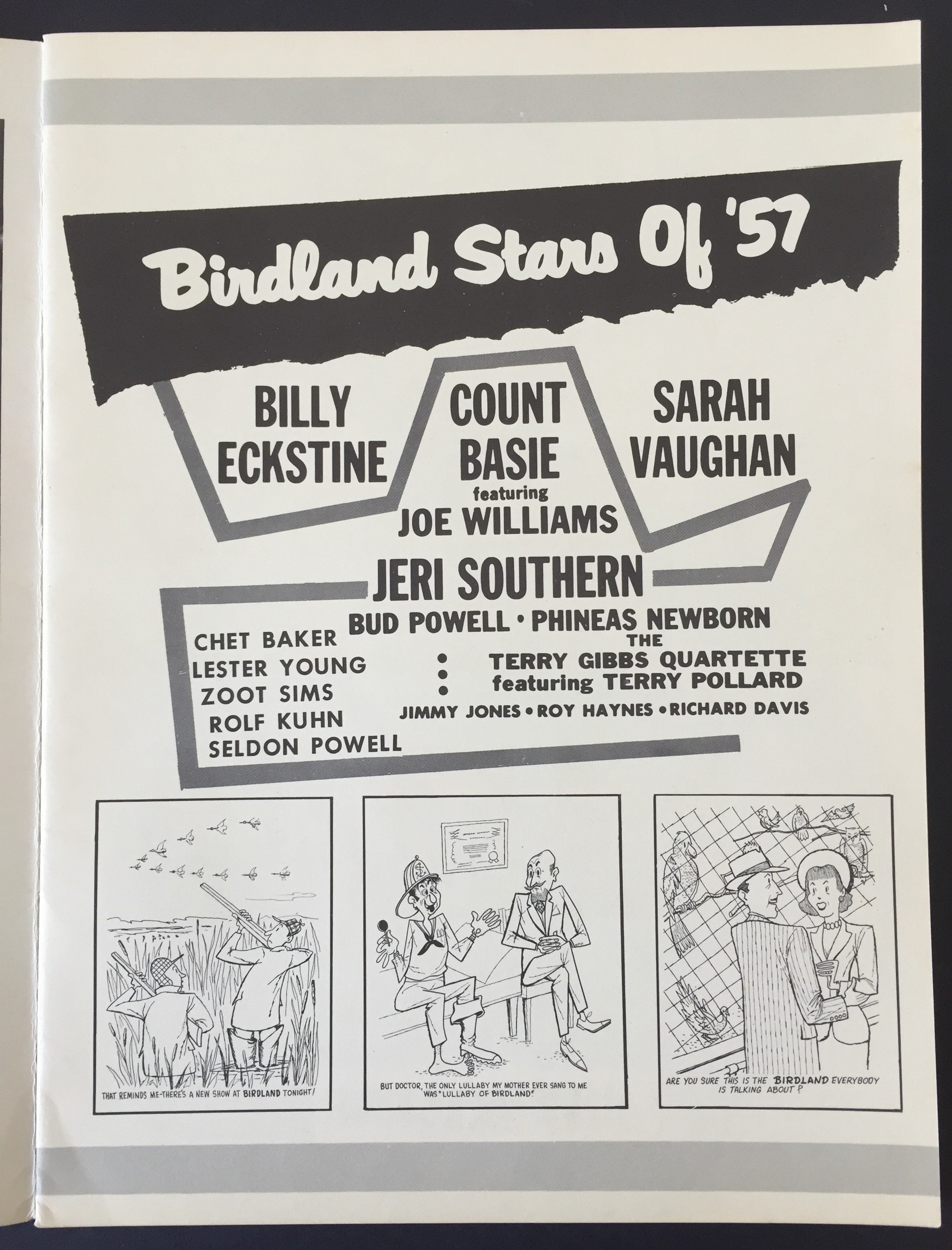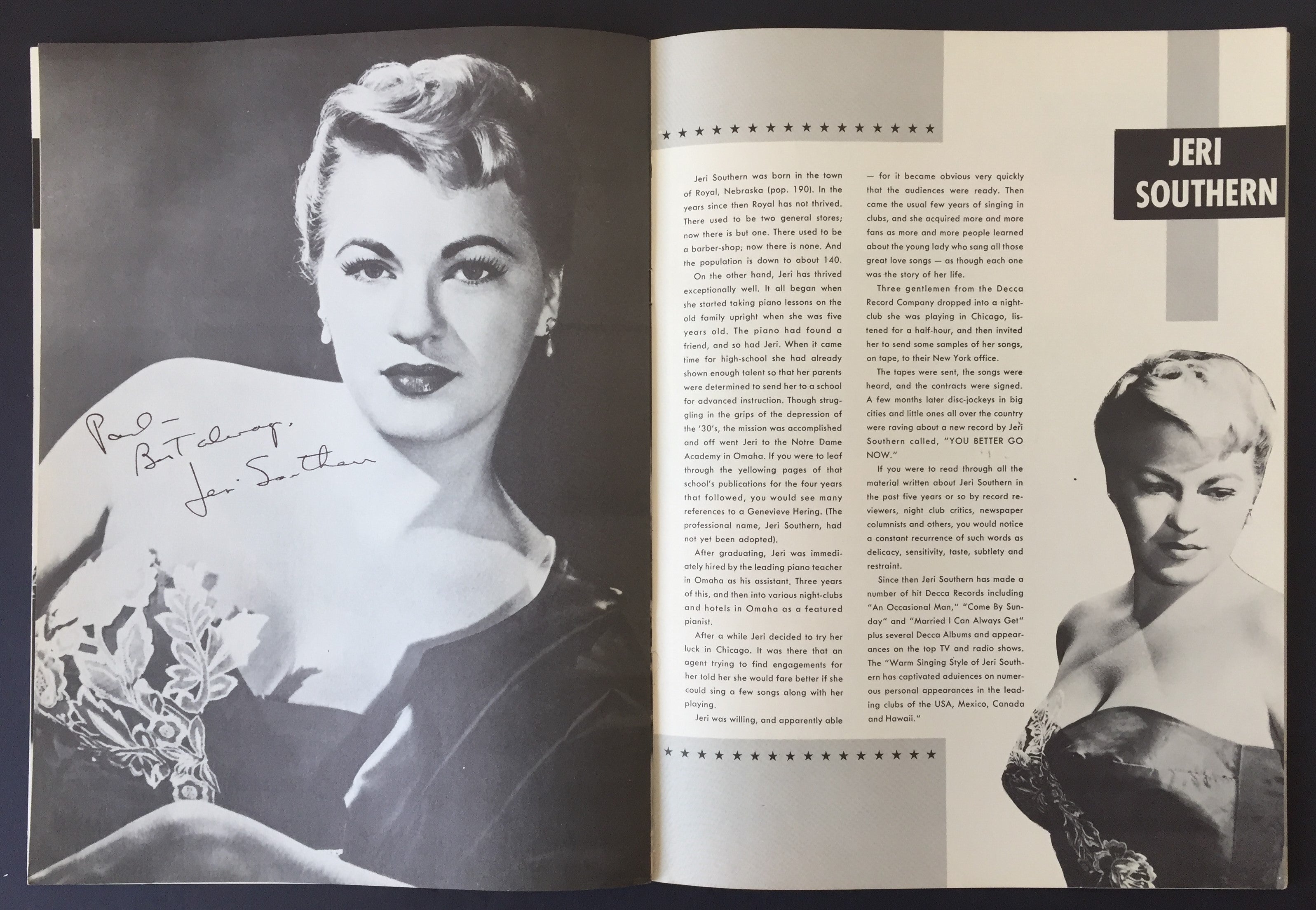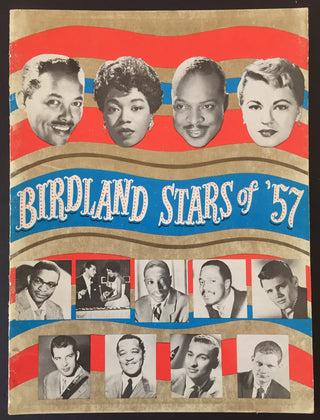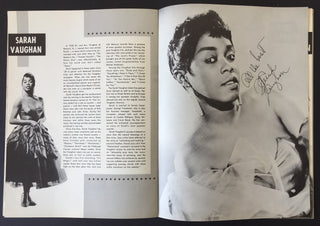 Vaughan, Sarah. (1924–1990) & Southern, Jeri. (1926–1991). "Birdland Stars of '57" - SIGNED SOUVENIR BOOKLET. Original souvenir program from the 1957 jazz tour, signed by vocalists Sarah Vaughan and Jeri Southern and also featuring photographs of Billy Eckstine, Count Basie, a young Chet Baker and others. Vaughan and Southern have inscribed their photographs to Paul McMahon (Southern has signed on two separate photographs.) 24 pp. Very slight wear to the spine and some toning, but overall in fine condition. 9 x 12 inches (22.7 x 30.5 cm).