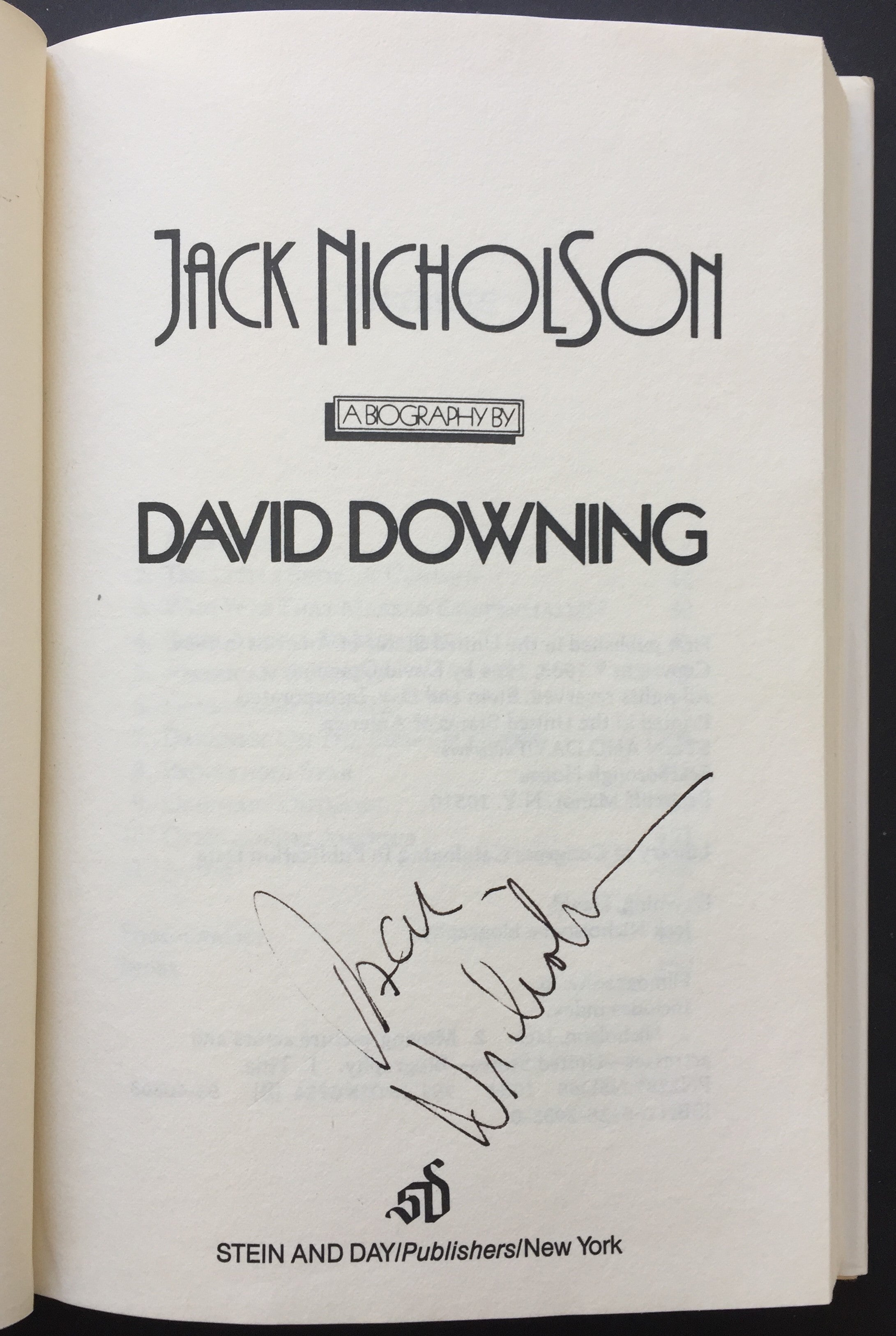 Nicholson, Jack. (b. 1937) [Downing, David.]. Jack Nicholson - SIGNED. New York: Stein and Day. 1984. Signed copy of the influential American actor and filmmaker's biography. Nicholson has signed boldly on the title page. 195 pp. Hardcover, quarter cloth, with dust jacket; in very fine condition. 5.5 x 8.5 inches (14 x 21.5 cm).