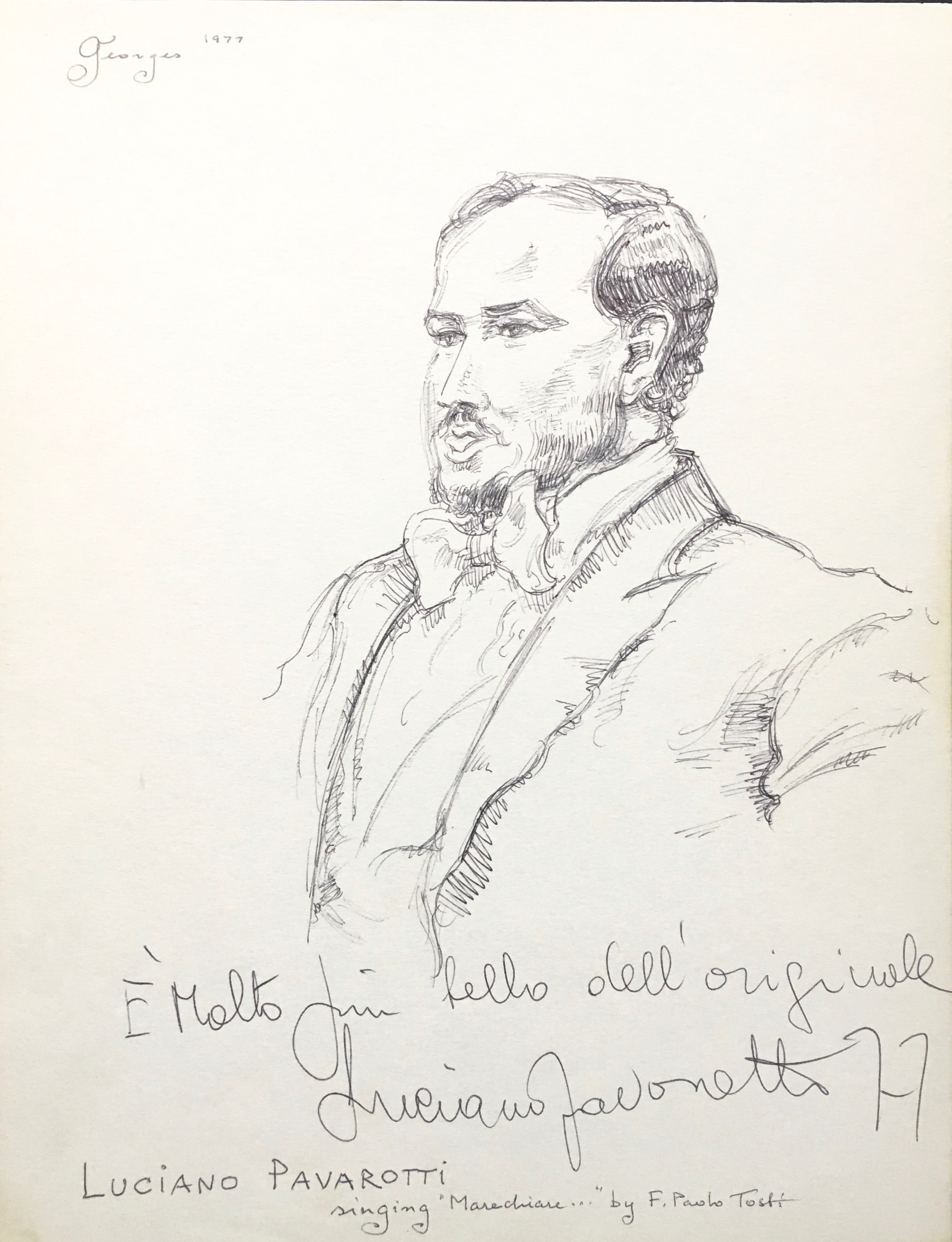 Pavarotti, Luciano. (1935-2007) [Krishizki, George. (1924-2001)]. Signed Drawing with humorous inscription. An original pen and ink illustration of the great tenor by artist George Krishizki, signed and inscribed by Pavarotti and dated 1977. Below his own image, Pavarotti has penned modestly (translated from the Italian): "Much better-looking than the original." The drawing is also signed by Krishizki at the head and titled at the foot: "Luciano Pavarotti / singing 'Marechiare' by F. Paulo Tosti." Slight toning. 9 x 12 inches.