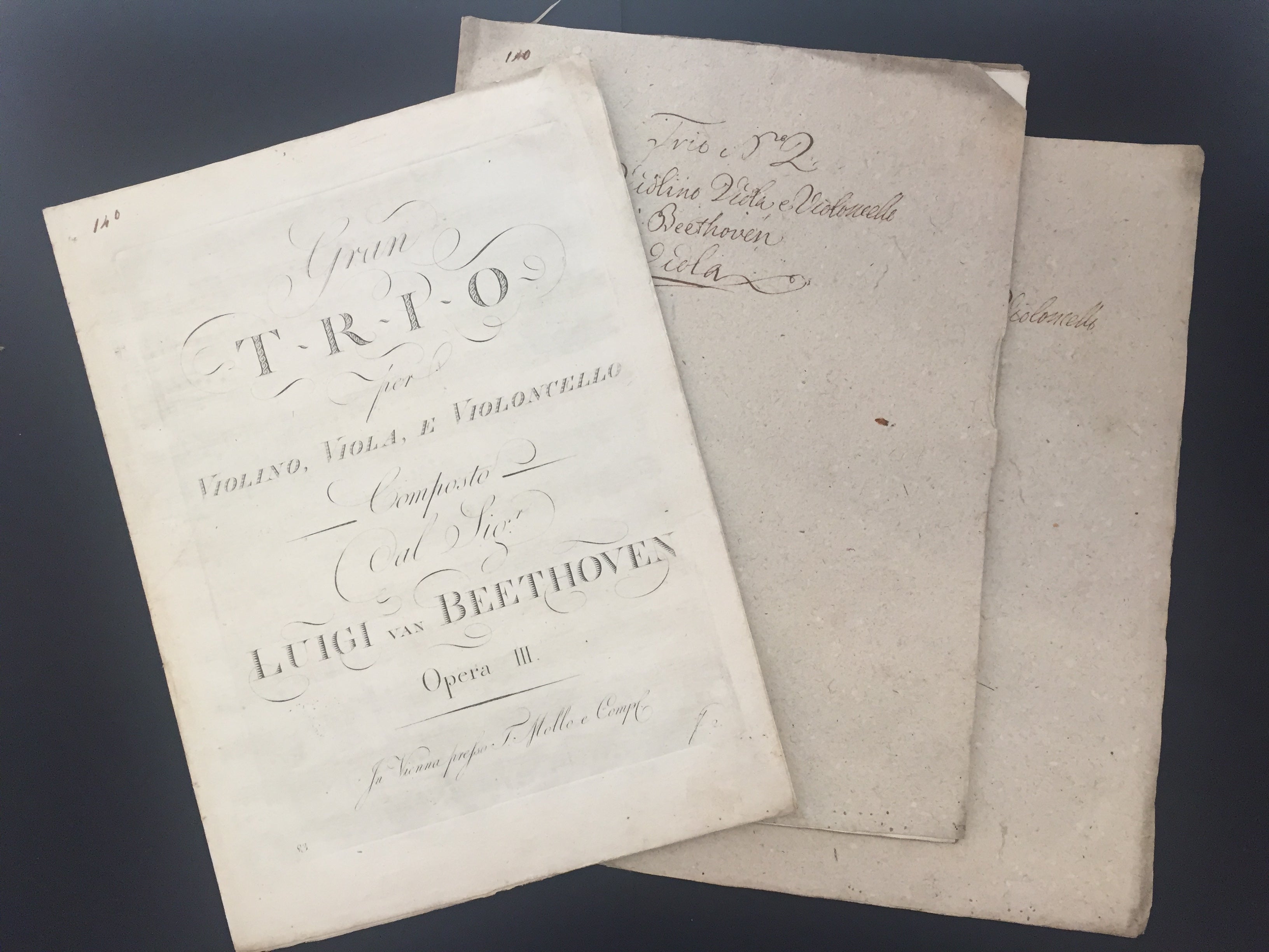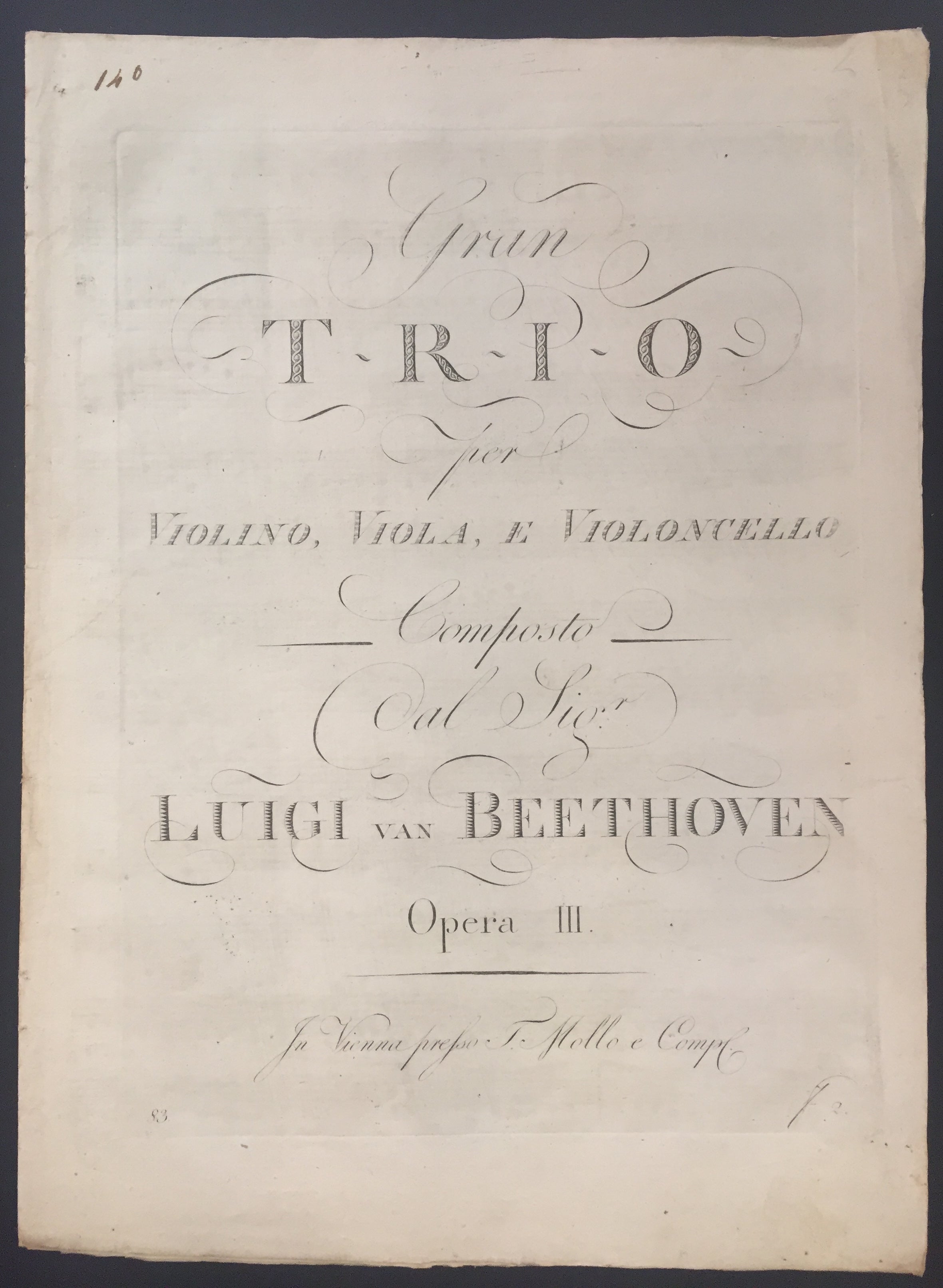 Beethoven, Ludwig van. (1770–1827). Gran Trio per Violino, Viola e Violoncello [...] Op. III.. In Vienna: Presso T. Mollo e Comp.. [1798?].