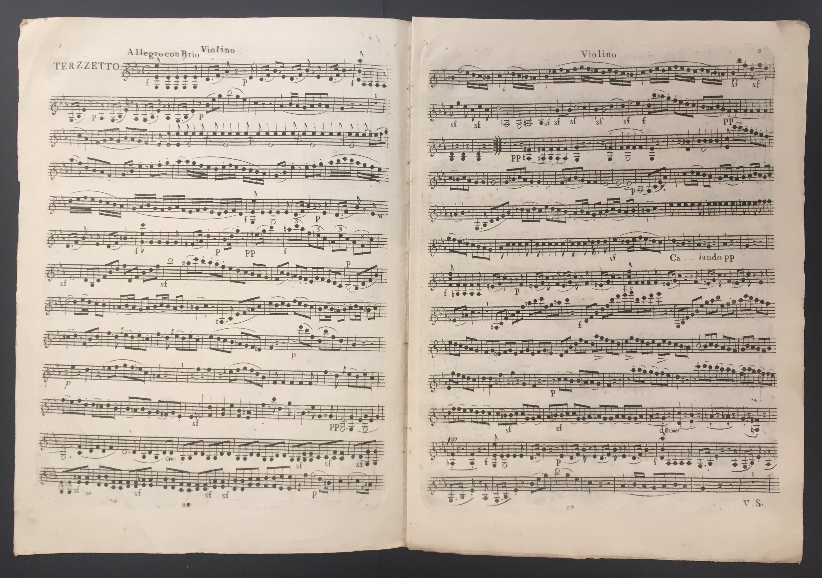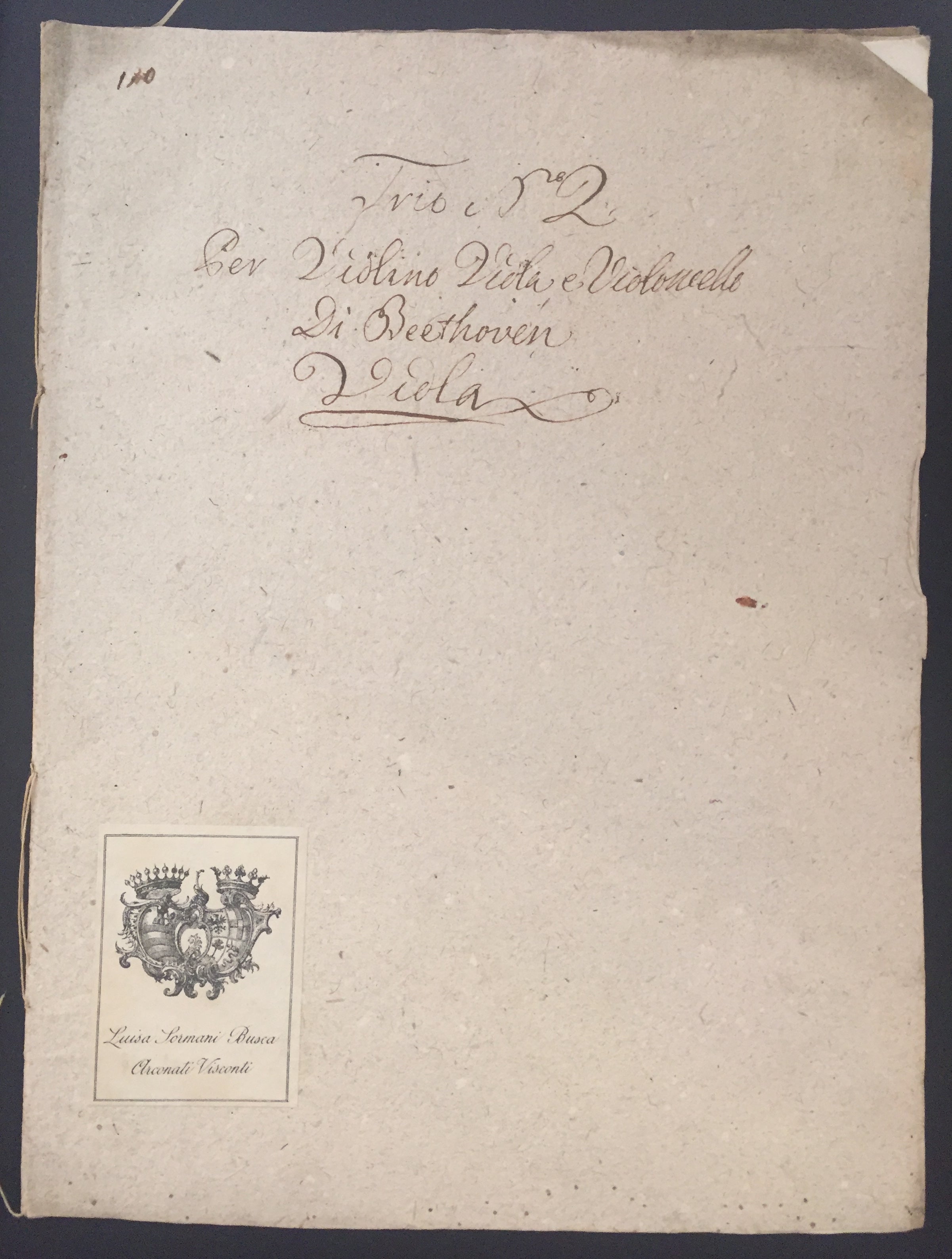 Gran / Trio / per / Violino, Viola, e Violoncello / Composto dal Sigr. Luigi van Beethoven / Opera. III. Folio Engraved throughout; [PN] 83. Parts. Violin part loose, as issued; viola and cello parts stitched into wrappers with handwritten titles. 13 pp. (Violino); 12 pp. (Viola); 11 pp. (Violoncello.) Ex libris Luisa Sormani Busca Arconati Visconti. Light toning and some smudging; overall in fine condition.