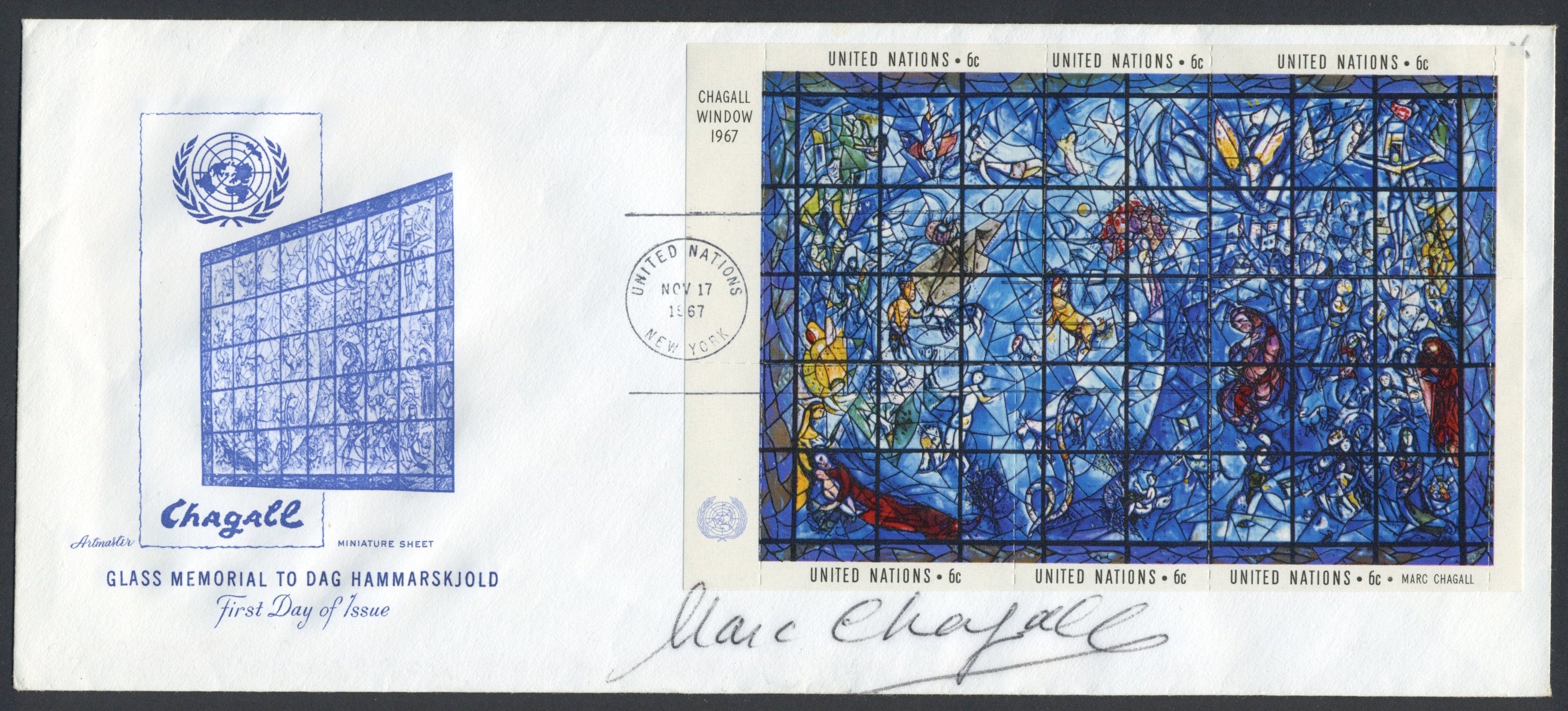 Signed FDC from the important Russian-French artist. Chagall has signed boldly at the foot of the envelope, on which is affixed an entire miniature sheet of stamps which together make up the entire of his stained glass Memorial to Dag Hammarskjold at the United Nations. Postmarked United Nations, November 17, 1967. Slight smudging at the lower edge, envelope lightly wrinkled; overall in fine condition. 8.75 x 4 inches (22.5 x 9.9 cm).