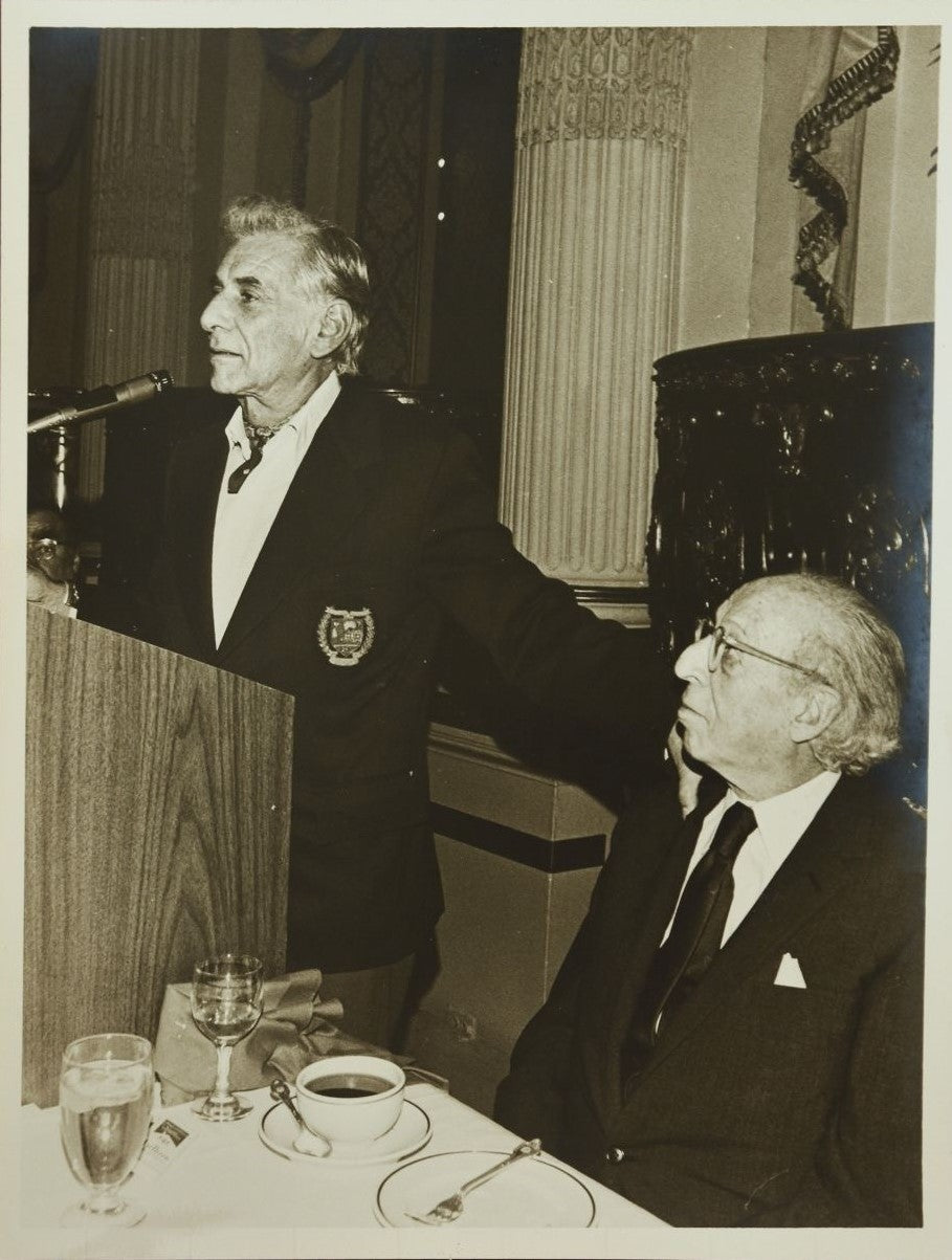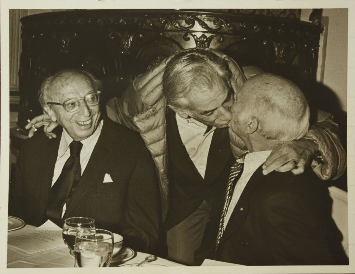 Two original photographs of great American composers Leonard Bernstein, Aaron Copland and William Schuman, apparently taken at a dinner ca. 1970's-1980's. In one photograph Bernstein is shown speaking at a podium while Copland listens; in the other, Bernstein kisses Schuman on the cheek while Copland looks on smiling. 8 x 10 inches. One stamped by the NY photographer "Camera 1" on the verso; the other with an affixed label from the Third Street Music School Settlement, NY. Fine.