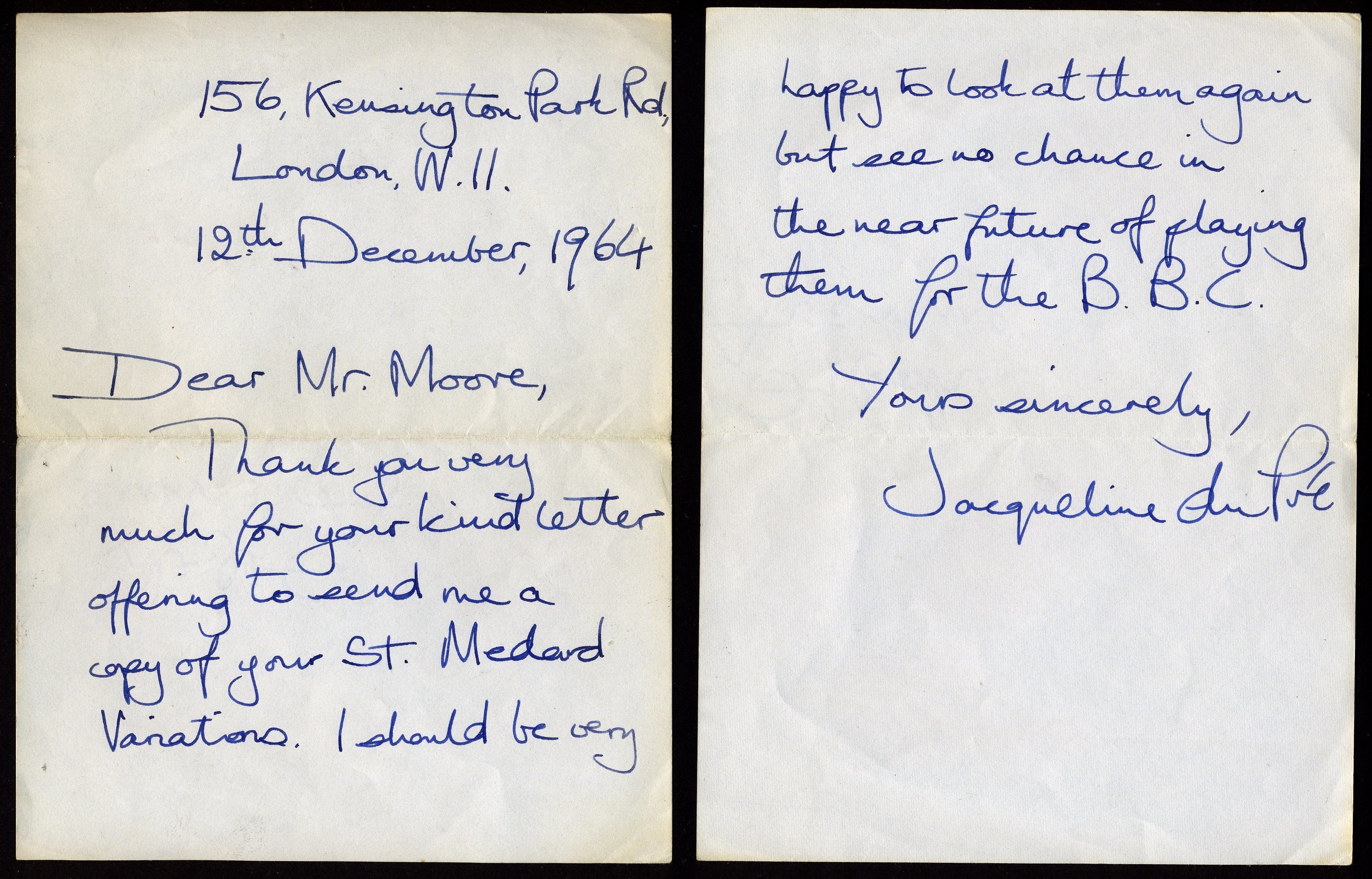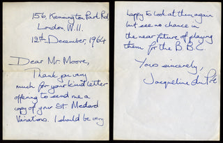 du Pré, Jacqueline. (1945–1987) [Moore, Timothy. (1922–2003)]. Autograph Letter. A rare autograph letter signed from the brilliant English cellist who died so tragically young, to British composer and pianist Timothy Moore. London, December 12, 1964. "Dear Mr. Moore, Thank you very much for your kind letter offering to send me a copy of your St. Medard Variations. I should be very happy to look at them again but see no chance in the near future of playing them for the B.B.C. Yours sincerely, Jacqueline du Pré." 2 pp. on 2 sheets. Folding creases and some light toning at the edges; overall in fine condition. 5.5 x 7 inches (13.6 x 17.8 cm).