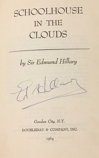 Two signed items from the New Zealand mountaineer and philanthropist known, with Tenzing Norgay, as the first to reach the summit of Mount Everest in 1953. His 1964 book Schoolhouse in the Clouds, an account of his philanthropic work building schools and providing medical care for children in Nepal, has been boldly signed "Ed Hillary" on the title page. xi, 180 pp. Hardcover, black cloth, without dust jacket. Slight split to the gutter and light shelf wear; overall in fine condition. 5.5 x 8.5 inches (14.3 x 21.3 cm).
