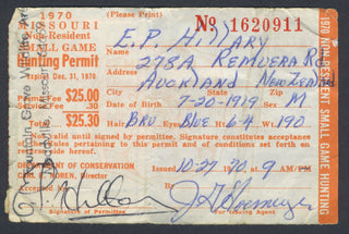 Together with an original Missouri small game hunting permit issued to Hillary in 1970, with his New Zealand address and information completed on the recto, and signed by him on recto and verso. Somewhat crumpled but overall very good. 3.75 x 2.5 inches (9.5 x 6.3 cm).