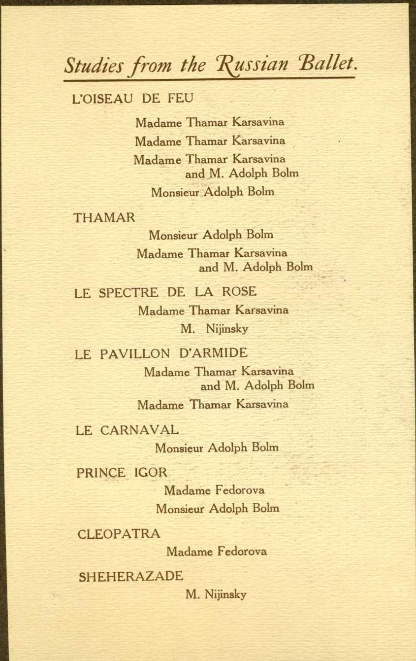 The five Diaghilev stars included in this collection are Vaslav Nijinsky, Adolph Bolm, Tamara Karsavina and Madame de Fedorova as seen in L'oiseau de feu, Thamar, Le spectre de la Rose, Le Pavillon d'Armide, Le Carnaval, Price Igor, Cleopatra, and Sheherazade.