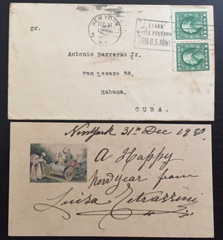 Tetrazzini, Luisa. (1871–1940). Autograph New Year's Postcard. Autograph postcard from the legendary coloratura soprano, who has elegantly penned "A Happy New Year from Luisa Tetrazzini" and dated New York, December 31, 1930. On a card with a small colored image of figures in a car. With the original envelope addressed by typewriter to a collector in Cuba and postmarked December 31. 13.5 x 7.5 cm.