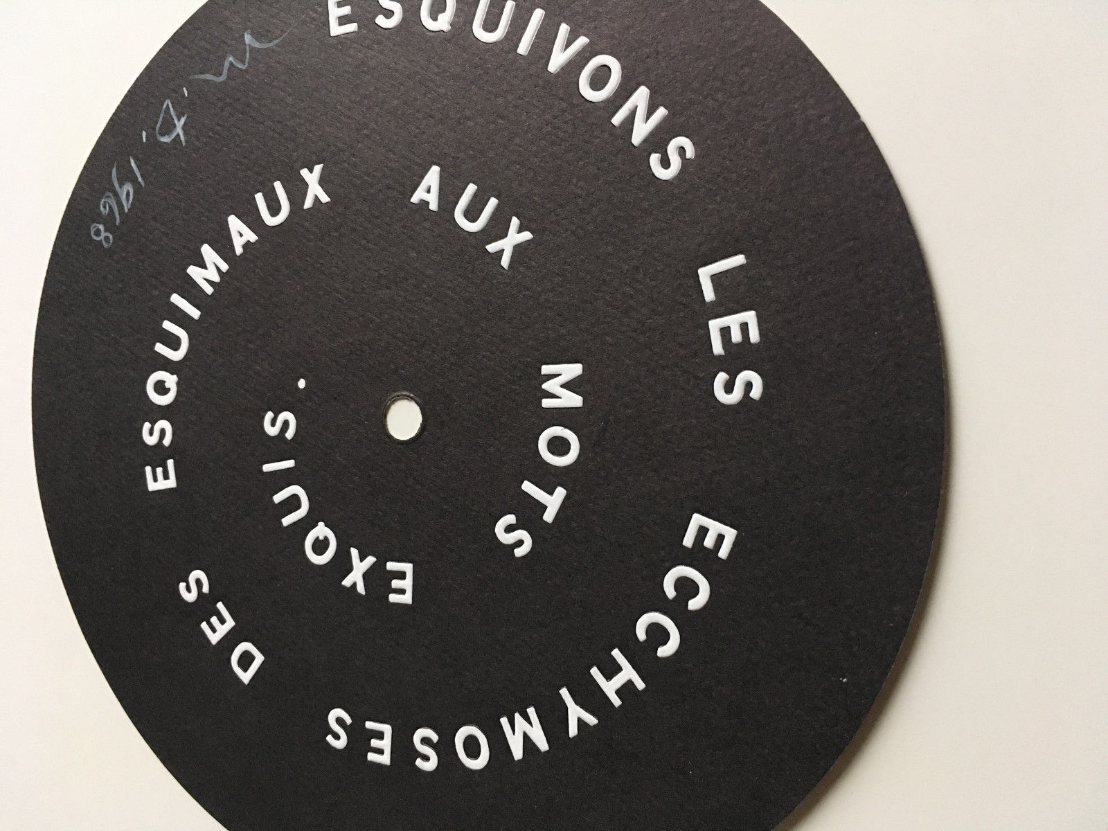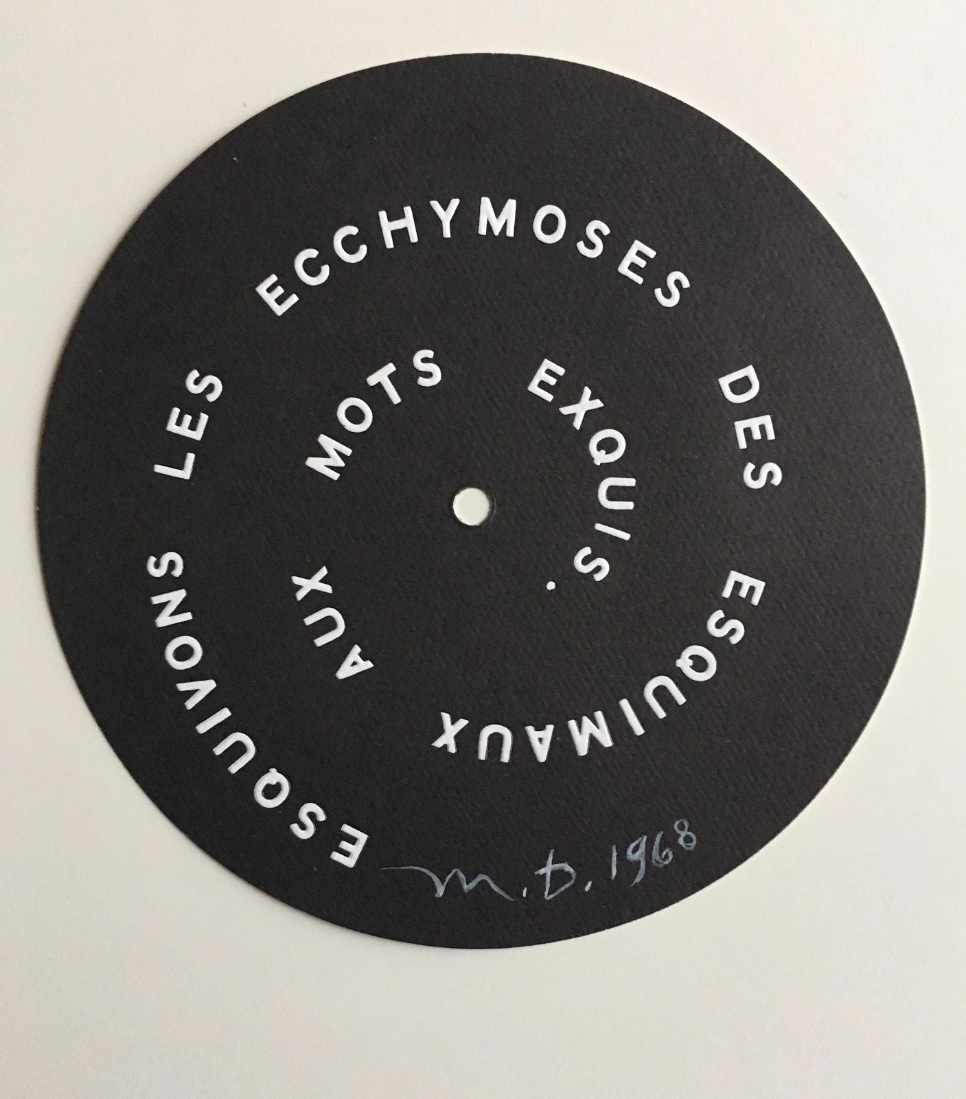 Among the most popular and gracefully rhythmic of Duchamp's puns is the one that reads ESQUIVONS LES ECCHYMOSES DES ESQUIMAUX AUX MOTS EXQUIS. This sentence was first published in a slightly variant form as "Nous estimons les ecchymoses des Esquimaux aux mots exquis" (We esteem the bruises of the Eskimos of exquisite words). Duchamp's puns have always presented a challenge for translators, but the puns in Anémic Cinéma were skillfully translated and analyzed in an article by Katrina Martin. Excerpts of her translation of the ECCHYMOSES pun follows: "Let us flee from (cleverly and with some disdain) the bruises of the Eskimoes who have exquisite words."