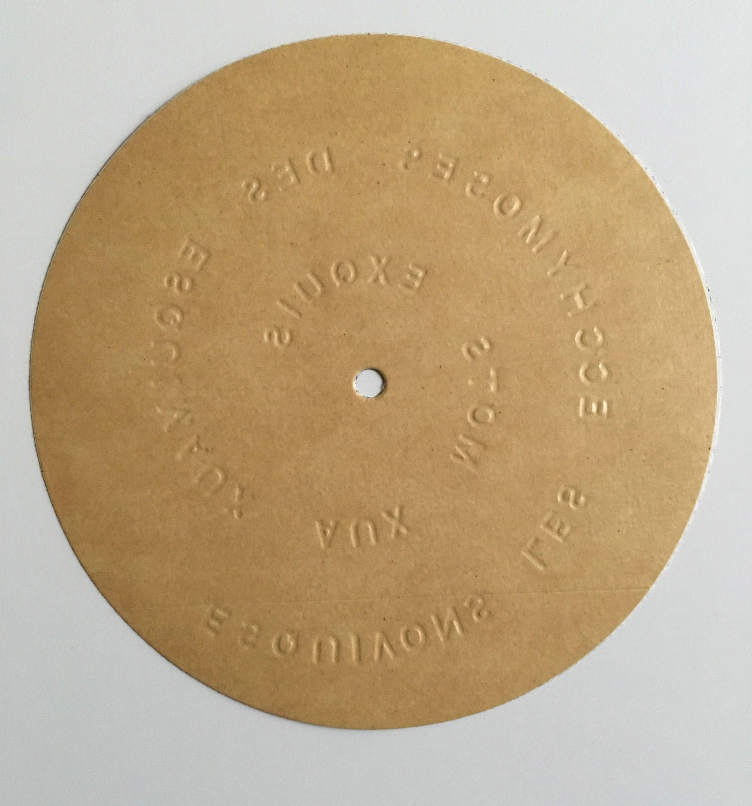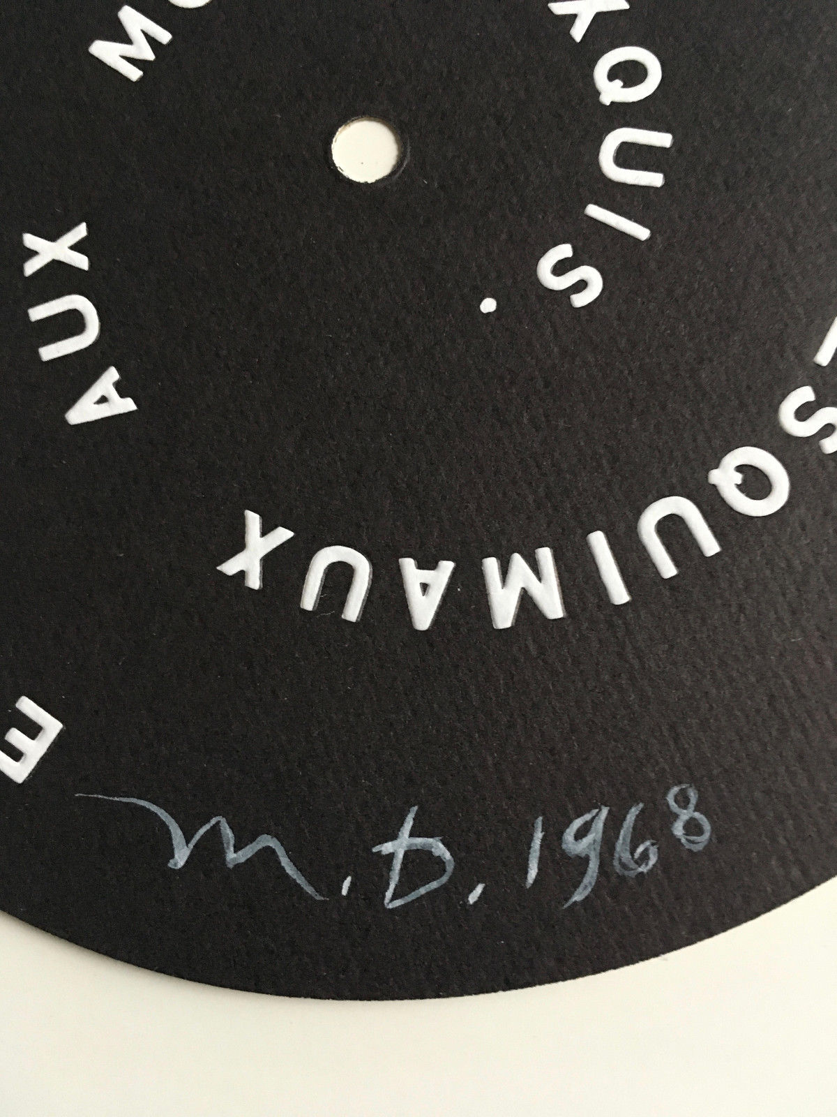 The present label was produced for the 1968 SMS Contrepetrie Record. SMS Portfolios were a collaboration between William Copley & Dmitri Petrov which they published through their Letter Edged in Black Press, working with some of the most important artists of the twentieth century. Exemplifying the community ethos of the '60s, Copley sought to produce a new form of art journal that would bypass traditional institutions to distribute the artist's work directly to its audience instead. Copley accepted contributions in almost any medium, carefully reproducing each artwork in his Upper West Side studio. All contributors, from the world-renowned to the obscure, received the same sum of $100 for their work. Presented without comment, each portfolio was mailed directly to subscribers every two months. Only six portfolios were produced, in an edition of 2000. Each portfolio contained from eleven to thirteen artist objects. The SMS edition record for which this label was produced is a seven-minute recording by Duchamp of "contrepetrie," a word play involving transposing words, letters, and syllables and their sounds to make puns and effect new meanings.