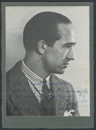 Signed photograph from the important Spanish pianist, known for his technical brilliance and vast repertoire. Halftone photograph, signed and inscribed over the image and mounted on card. Dated Paris, May 23, 1933. Rather poor contrast to the inscription, but otherwise in fine condition. 5.5 x 7.5 inches (14 x 19.5 cm).