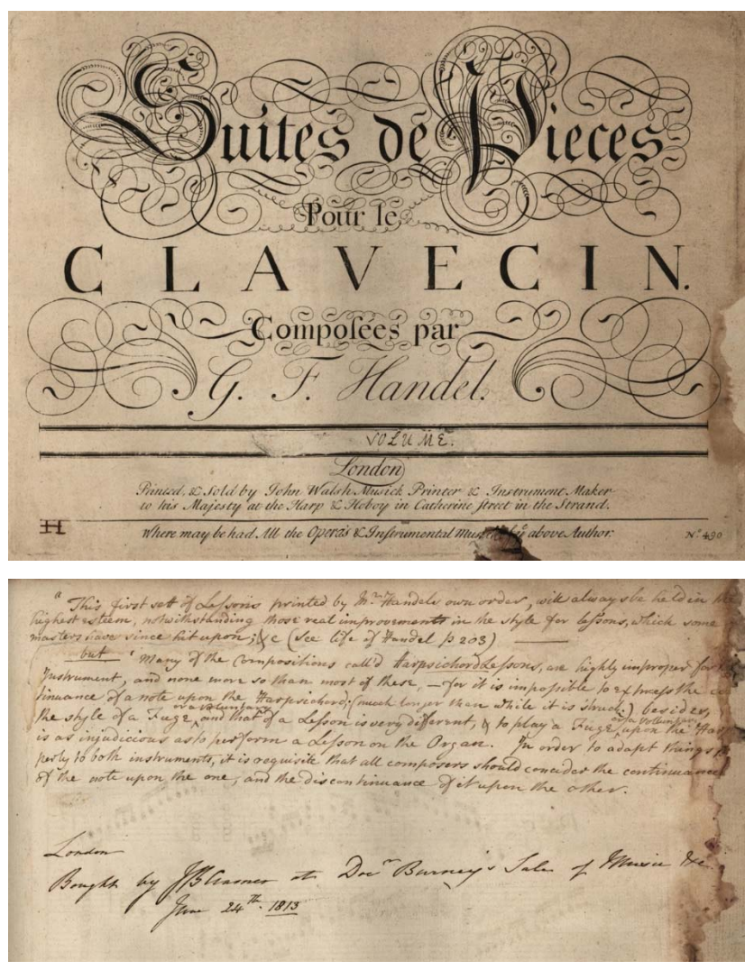 Suites de Pieces pour le Clavecin, composées par G. F. Handel. Early edition of Handel's 8 Great Suites, HWV 426–433, with extensive holograph inscriptions from prominent owners Charles Burney, J. B. Cramer and Friedrich Chrysander. [PN] 490. 94 pp. Oblong folio. Händel-Jahrbuch III, S. 213; RISM H/HH 1438; Kat. Hoboken 5 Nr. 174. In very good condition: damp stains along the right edge margin with those to the edges of the title and first page restored; on the title page, the printed indication "I. Volume" has been removed and replaced with manuscript "Volume." A remarkable and historic copy.