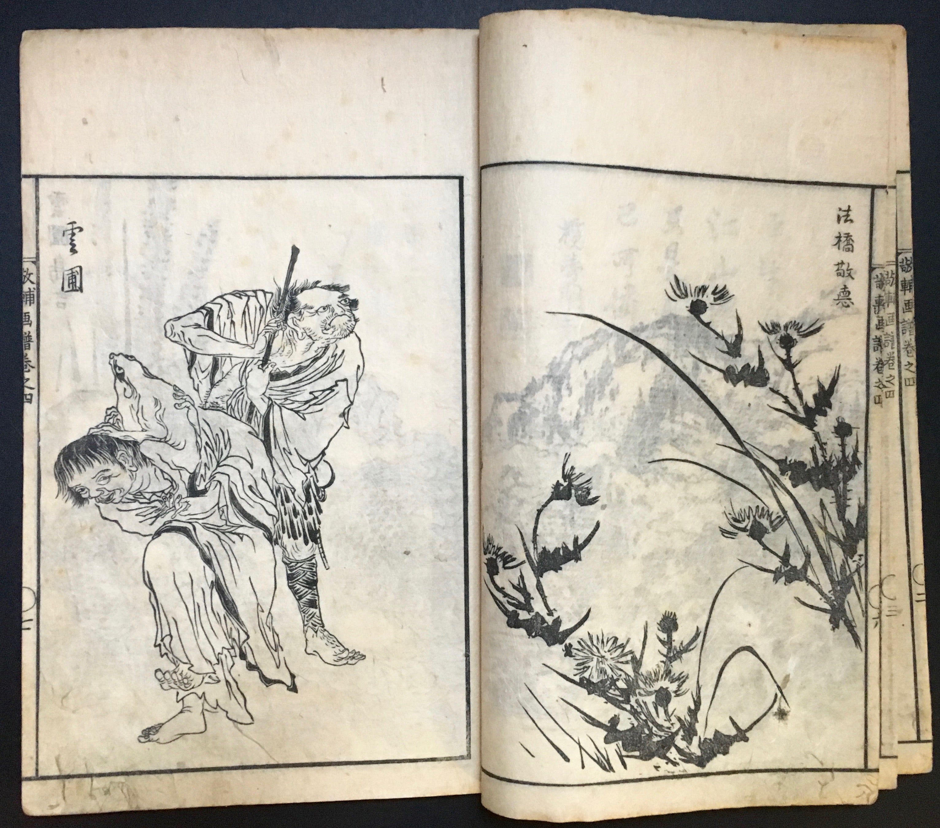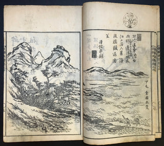 Collection of Chinese woodblock prints depicting nature scenes, groups of people, and several pages of text, in grey and black ink. 62 pp. Softcover. Overall toning and external wear; in very good condition. 7 x 10.25 inches (17.8 x 26.2 cm).