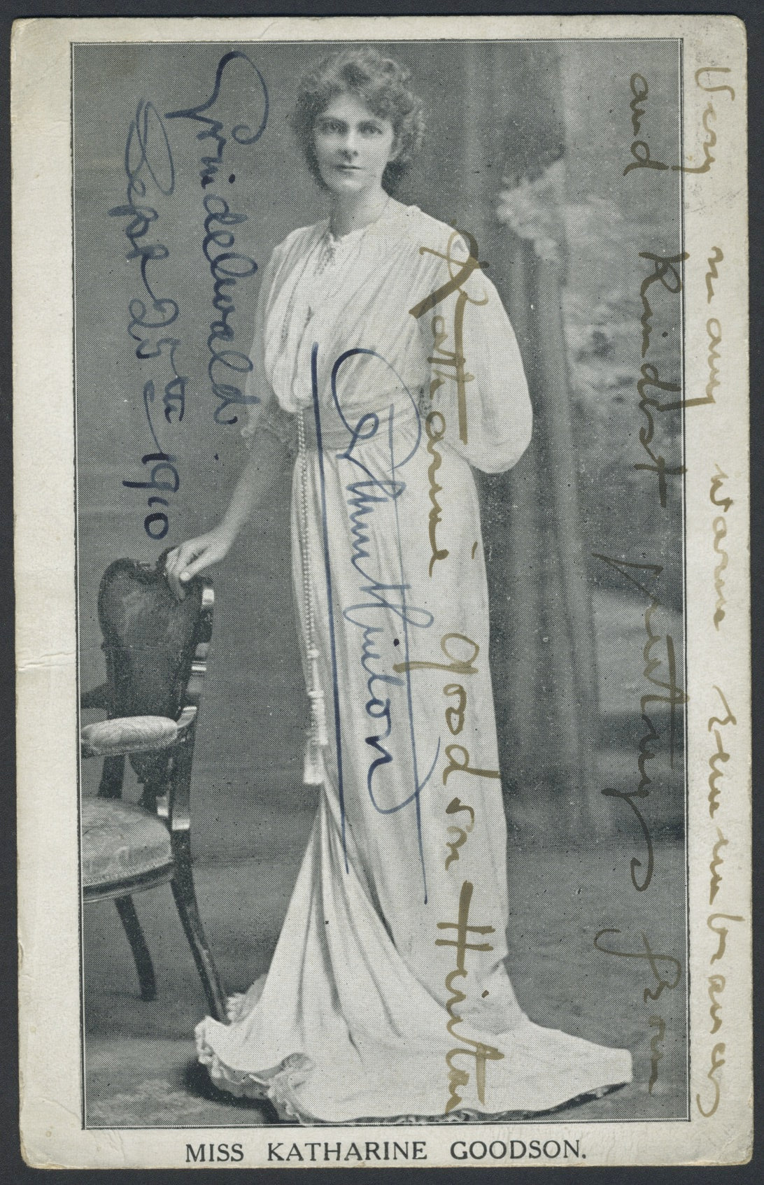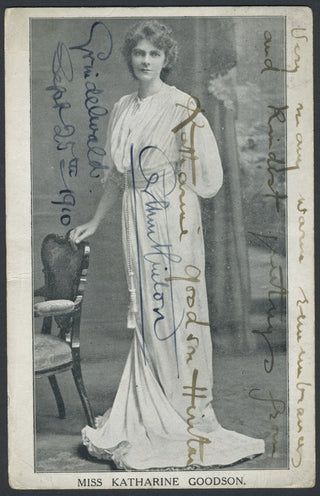 Original postcard photograph of the eminent British pianist, a student of Leschetizky who enjoyed a long international career and performances with Nikisch, Beecham and others. She has signed and inscribed boldly over the image, above a further signature from her husband, composer Arthur Hinton, who has dated Grindelwald, September 25, 1910. Addressed on the verso to H. Clement Esq. in New York City. Some light overall soiling and toning, with light edge wear; overall in very good condition. 3.5 x 5.5 inches (9 x 14 cm).