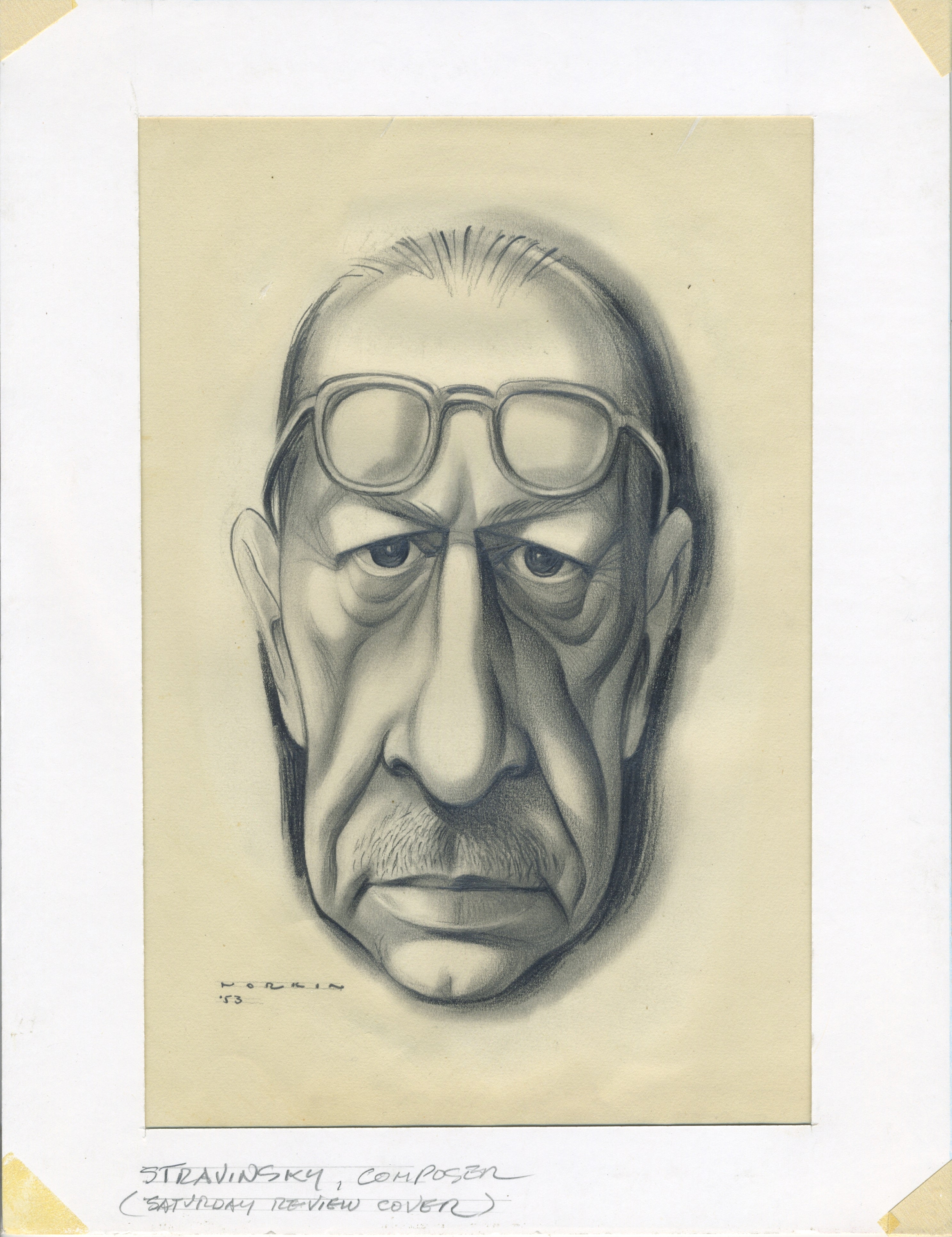 A striking original portrait of the important composer, drawn by noted American illustrator and caricaturist Sam Norkin for the cover of the Saturday Review (published February 14, 1953). Stravinsky is shown with his glasses pushed halfway up his forehead, the creases of his face dramatically shadowed. Norkin has signed and dated 1953 at the left. Pencil on paper, mounted on card and covered in plastic and a paper mat (could easily be removed.) Overall very fine. 8.5 x 11 inches.