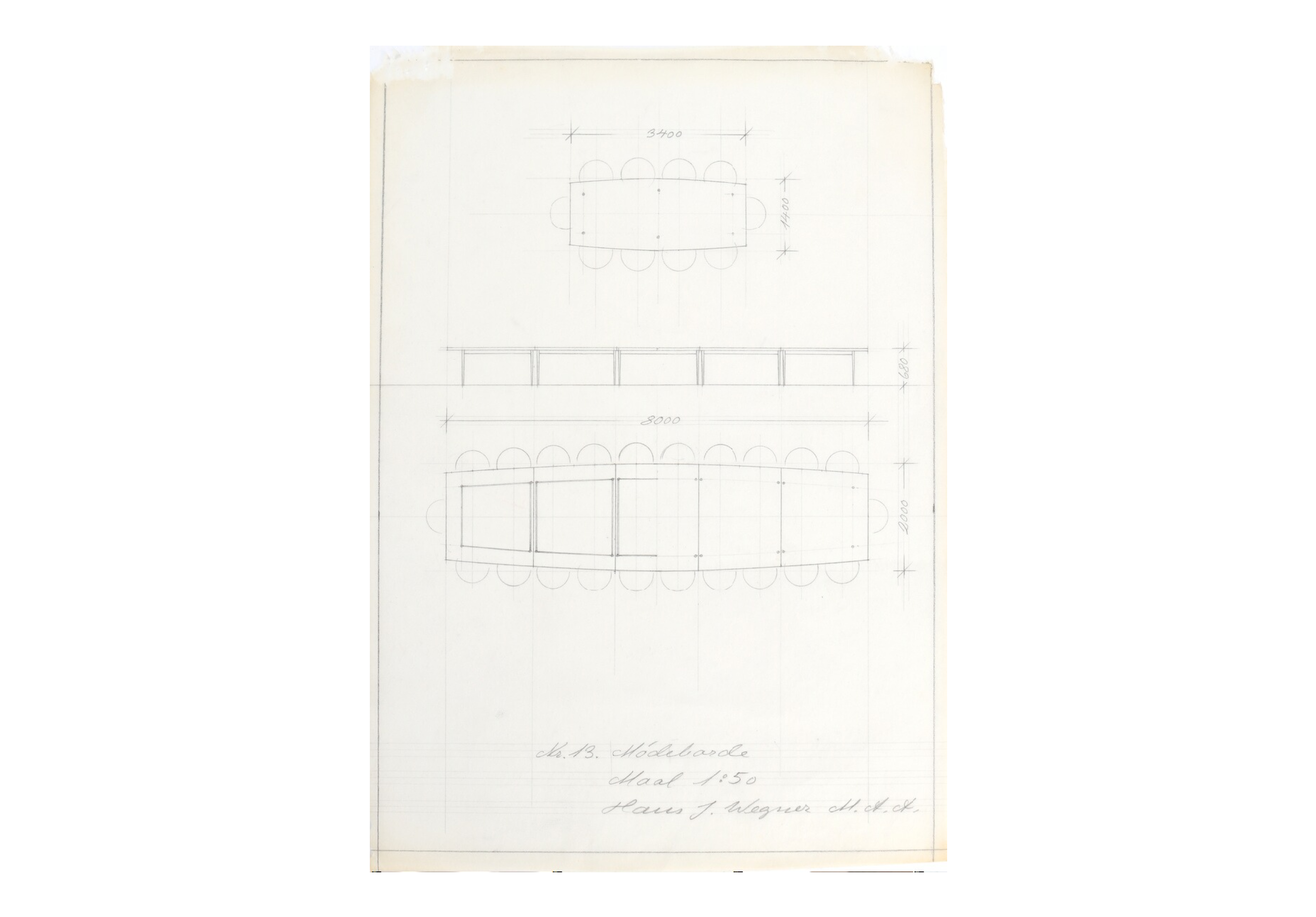 An original design for a meeting table from the world-renowned Danish furniture designer, from the 800-office series. Drawn in pencil, signed at the lower right, and labeled no. 13, scale 1:50. Some edge wear and chips; overall in fine condition. 8.75 x 12.25 inches (21 x 30 cm.) From the workshop of cabinetmaker Johannes Hansen.