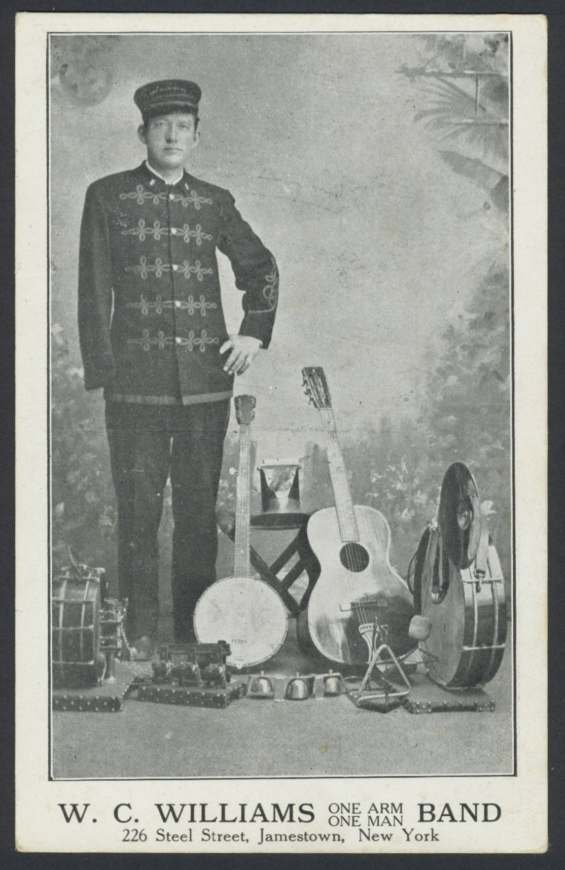 An interesting vintage postcard, ca. 1910's-20's, showing the one-armed entertainer W. C. Williams and his "One Arm One Man Band," which includes guitar, banjo, and a variety of percussion instruments. In fine condition. 3.5 x 5.5 inches (9 x 14 cm).