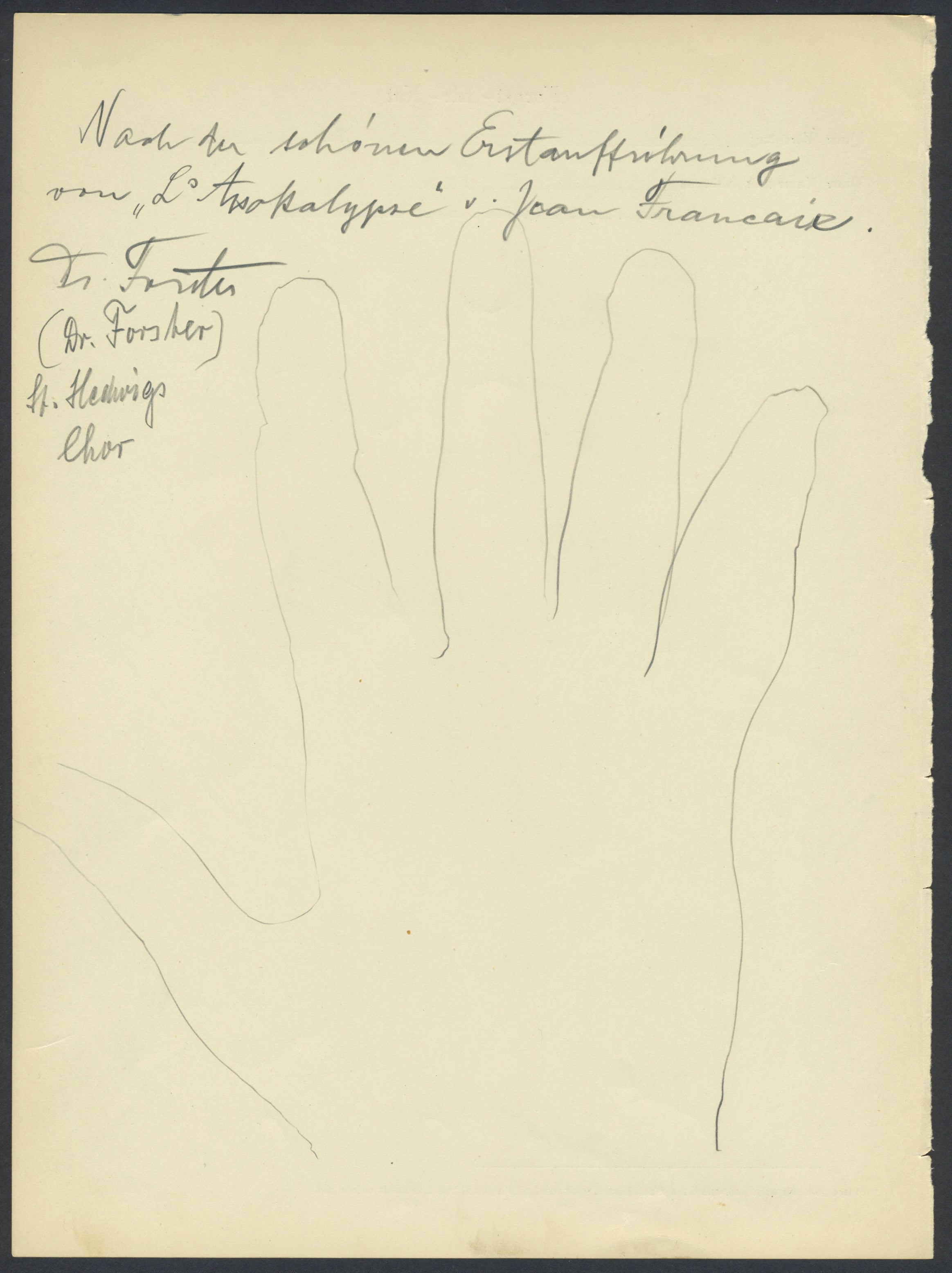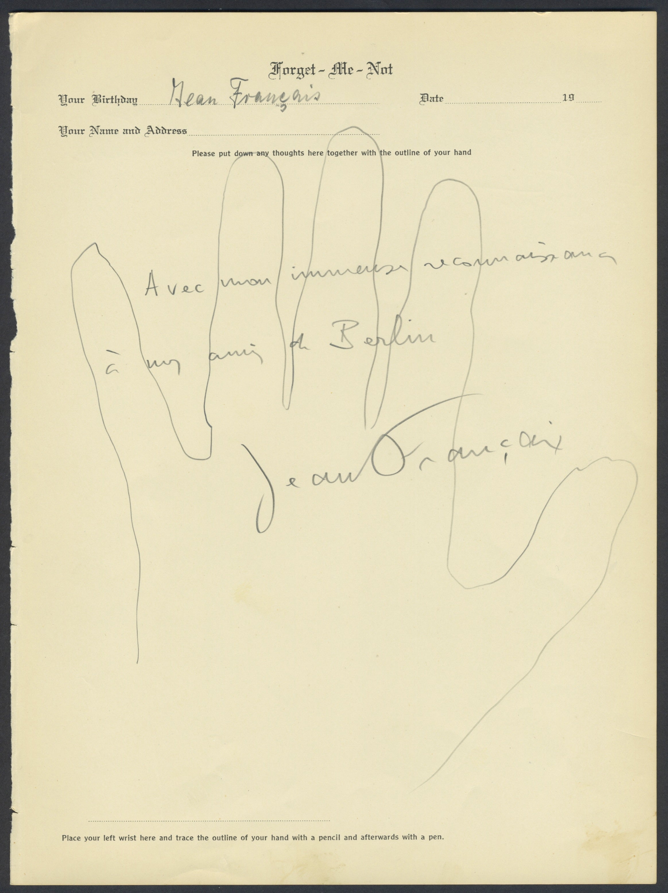 Françaix, Jean. (1912–1997) & Forster, Karl. (1904–1963). Signed Hand Tracing. Original outline of the French composer's left hand, traced in pencil, boldly signed and inscribed to "un ami de Berlin" on an album leaf titled "Forget-Me-Not." On the verso, a further hand tracing and signature from Karl Forster, director of the choir of the Hedwigs-Kathedrale, Berlin, with a note indicating that the signatures were given at the premiere of Françaix's oratorio L’apocalypse selon St-Jean (1939). Left edge rough and some light toning; overall in fine condition. 7.5 x 10 inches (19 x 25.7 cm).
