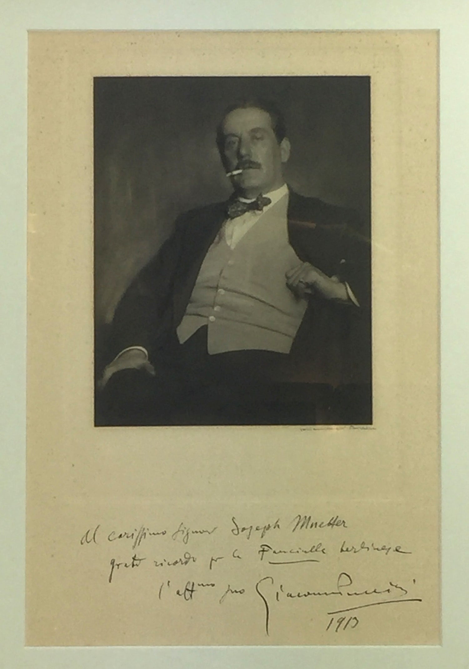Puccini, Giacomo. (1858–1924) [Schenker, Karl. (1886–1954)]. JUMBO Signed Photograph, inscribed at the German premiere of "Fanciulla." . Exceptional large original platinum print photograph (17.5 x 22 cm) showing the great composer in a reclining seated pose with cigarette. Photograph by the important photographer Karl Schenker, who signs in pencil beneath image on the mount "Schenker, Berlin", measuring an impressive 28.5 x 43 cm. Boldly inscribed by the composer in Italian in ink on the mount, translated in full: "To dearest Mr. Joseph Muetter, great memories of the Berlin Fanciulla...affectionately yours Giacomo Puccini 1913". A stunning image, with the lightest of toning to the mount and overall in very fine condition. Beautifully framed in pink-hued gold over wood to 44 x 54 cm overall.